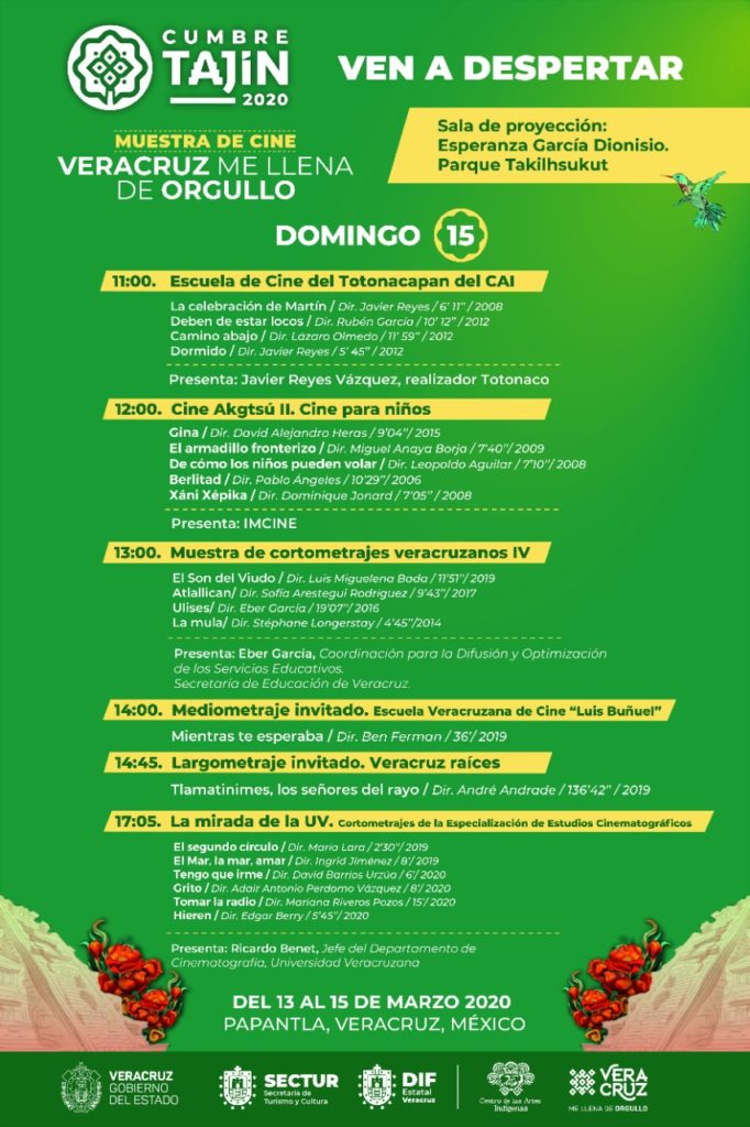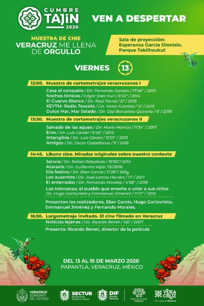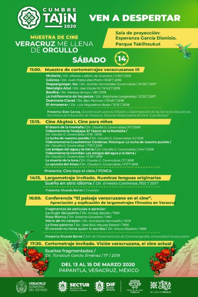 Xalapa, Ver.- Durante Cumbre Tajín 2020 se exhibirán más de 60 películas en la Muestra de Cine “Veracruz me llena de orgullo”, el cual es un acontecimiento cinematográfico en torno a las identidades, el turismo y la difusión del patrimonio cultural veracruzano.