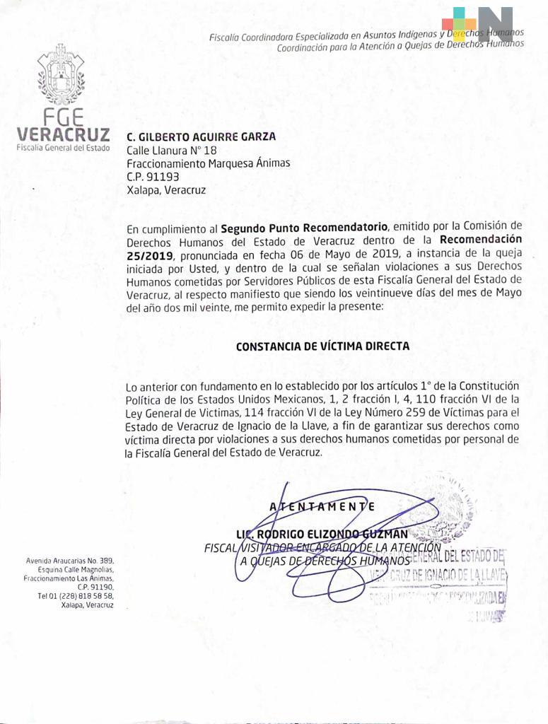- Extiende FGE constancia de víctima directa a Gilberto Aguirre Garza