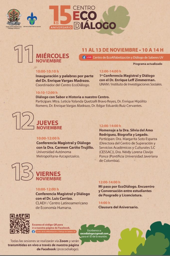 Xalapa, Ver.- Para celebrar los 15 años del Centro de Ecoalfabetización y Diálogo de Saberes (EcoDiálogo) de la Universidad Veracruzana (UV), se llevará a cabo del miércoles 11 al viernes 13 de noviembre un ciclo de conferencias de forma virtual, en donde se charlará sobre la historia de este centro.