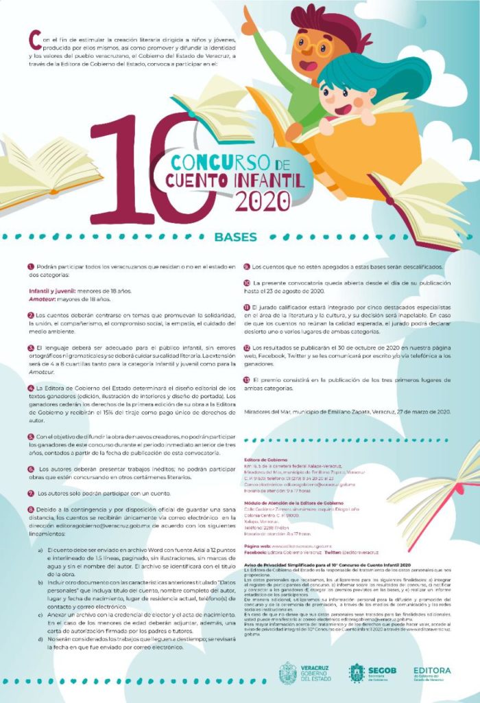 Miradores del Mar., mpio. de Emiliano Zapata, Ver.- Para fortalecer el trabajo editorial orientado a estimular la creación literaria entre las niñas, niños y jóvenes de Veracruz emprendido por el gobernador Cuitláhuac García Jiménez, la Editora de Gobierno lanzó la convocatoria del 10º Concurso de Cuento Infantil 2020.