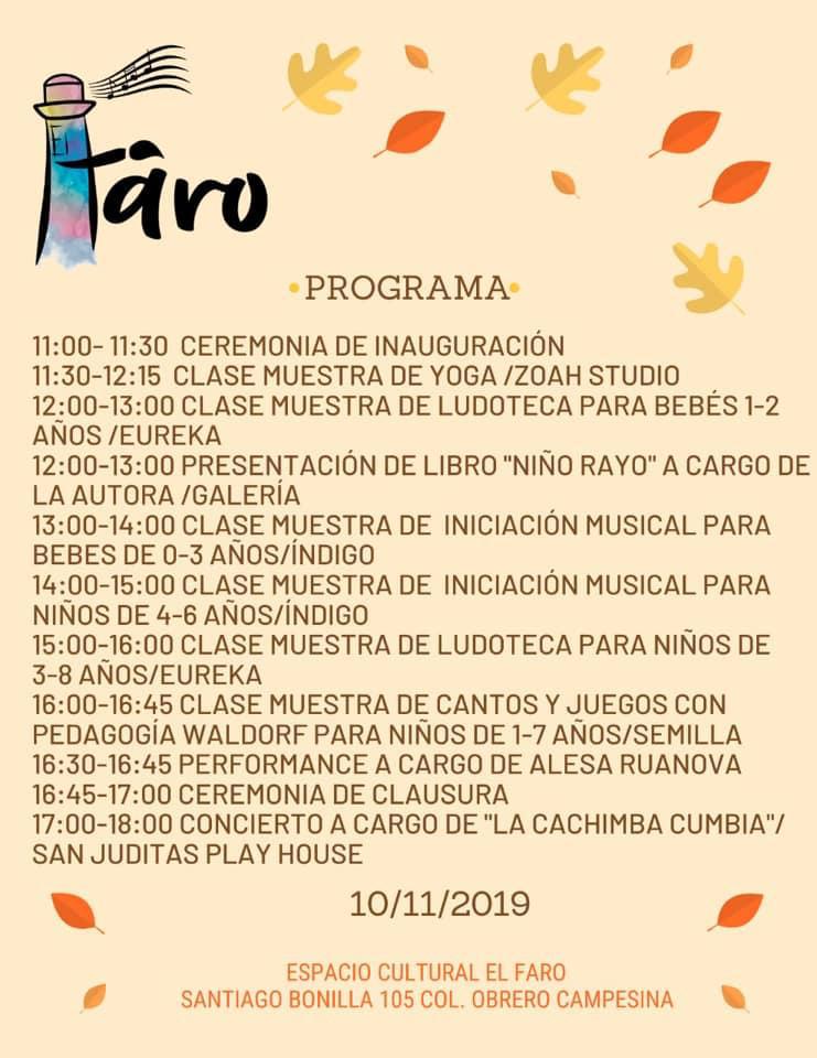 De 15:00 a 16:00 horas, se presenta la ludoteca para niños de 3 a 8 años; de 16:00 a 16:45, una clase muestra de cantos y juegos con pedagogía Waldorf para niños de 1 a 7 años; de 16:30 a 16:45, un performance a cargo de Alesa Ruanova, y de 17:00 a 18:00 horas, el concierto a cargo de La Cachimba Cumbia.