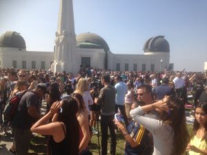 El Observatorio Griffith, situado en la parte más alta de la ciudad de Los Ángeles, se convirtió en el lugar ideal de los amantes de la astronomía para ver el eclipse. La multitud se congregó en este llamado santuario de la ciencia desde muy temprano tanto para ver el eclipse como para adquirir los codiciados lentes que anunció el observatorio pondría a disposición en cantidad suficiente para todos los interesados.