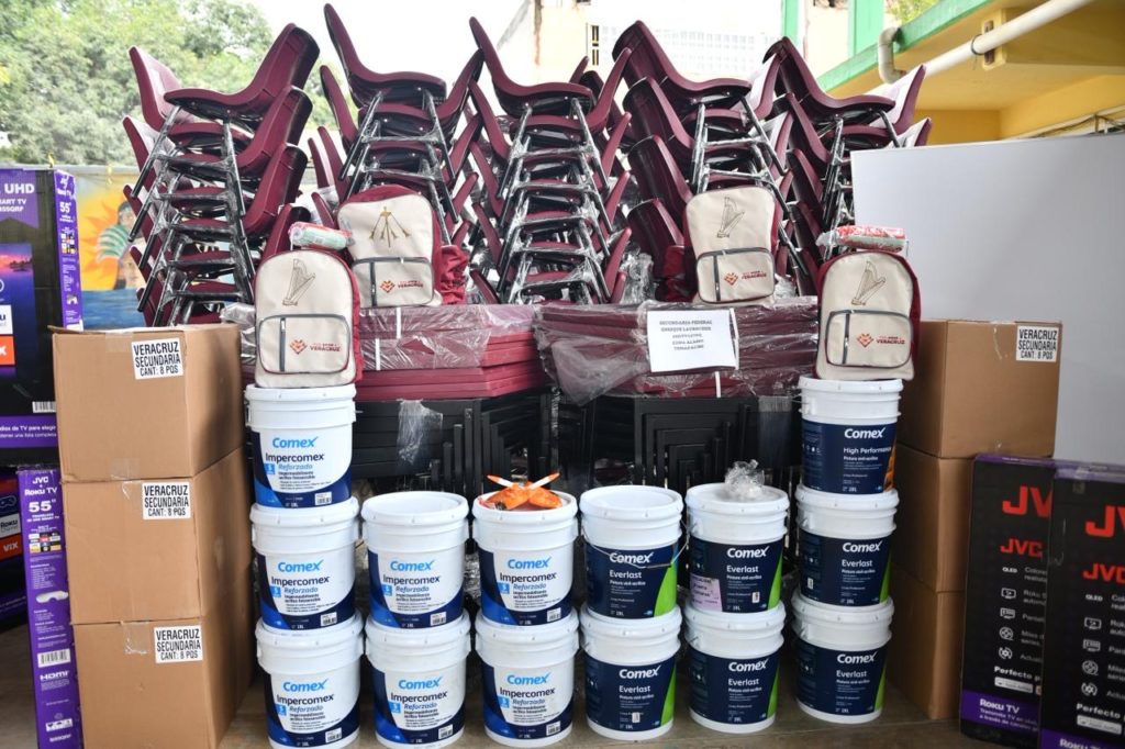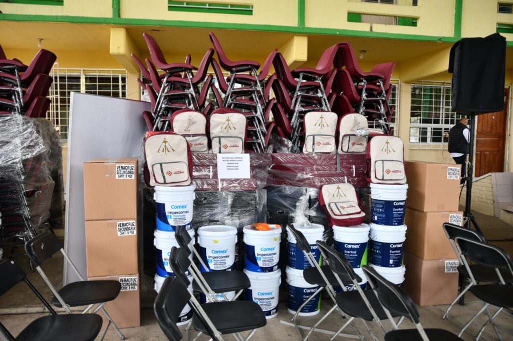 Durante su segunda visita al municipio en lo que va del año, explicó que, como respuesta a los daños provocados por las inundaciones de octubre pasado, el Estado entregó mil 633 kits escolares, 863 sillas, 432 mesas trapezoidales, 10 pupitres para personas zurdas, 158 cubetas de impermeabilizante, 98 cubetas de pintura, 74 pizarrones y 31 pantallas de 55 pulgadas para telesecundarias, así como 28 brochas y 28 rodillos.