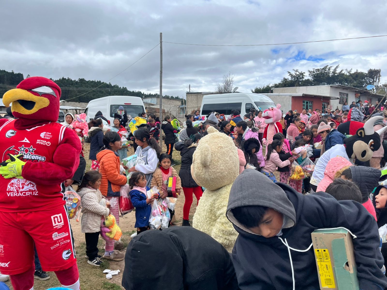 Veracruz, Ver.- El trineo de Yeyo Claus, campaña de recolección y entrega de juguetes organizada por Yeyo el Halcón, mascota de los Halcones Rojos de Veracruz, llevó alegría a las niñas y niños de la comunidad El Conejo, en las faldas del Cofre de Perote.