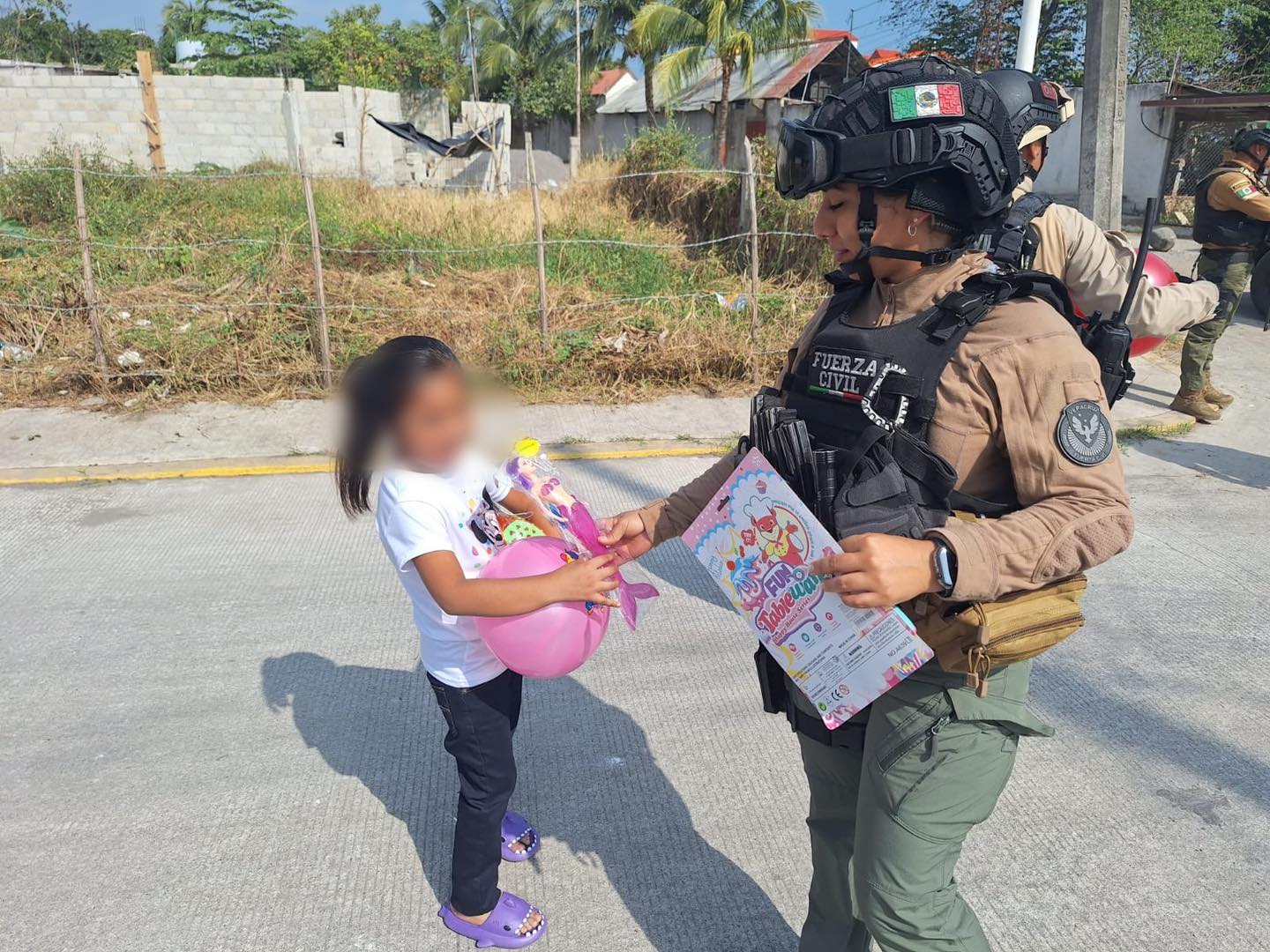 «Con el objetivo de mantener la ilusión y esperanza en el corazón de nuestros niños y niñas; este #DíaDeReyes la SSP a través de elementos de Fuerza Civil realizan entrega de juguetes en Úrsulo Galván y Veracruz.