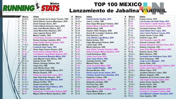 Coatzacoalcos, Ver.- El veracruzano Eliezer Buenaventura, fue incluido en el Top 100 de los mejores exponentes de todos los tiempos, en la prueba de lanzamiento de jabalina varonil, lista publicada por “Running Stats México”.