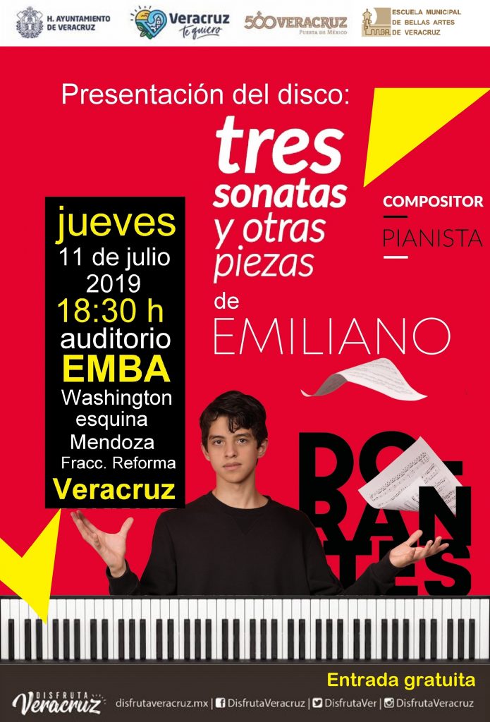 Veracruz, Ver.- Como parte de las actividades de difusión cultural que organiza la Escuela Municipal de Bellas Artes de Veracruz (EMBA), se realizará en sus instalaciones, el jueves 11 de julio, a las 18:30 horas, la presentación del disco titulado “Tres sonatas y otras piezas”, del joven compositor y pianista Emiliano Dorantes Meseguer.