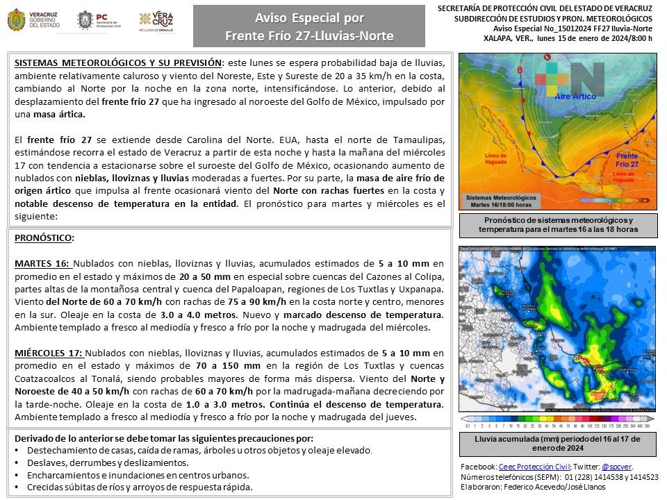 “El aviso especial en prácticamente 10 días más o menos llevamos diariamente emitiendo este tipo de avisos y o de alertamientos y eso tiene que ver por la frecuencia con la que han estado llegando los frentes fríos, el 25, el 26 y en este momento la el aviso está enfocado a los efectos del frente frío número 27, un frente frío que ya viene desplazándose sobre el noroeste de del Golfo de México”.