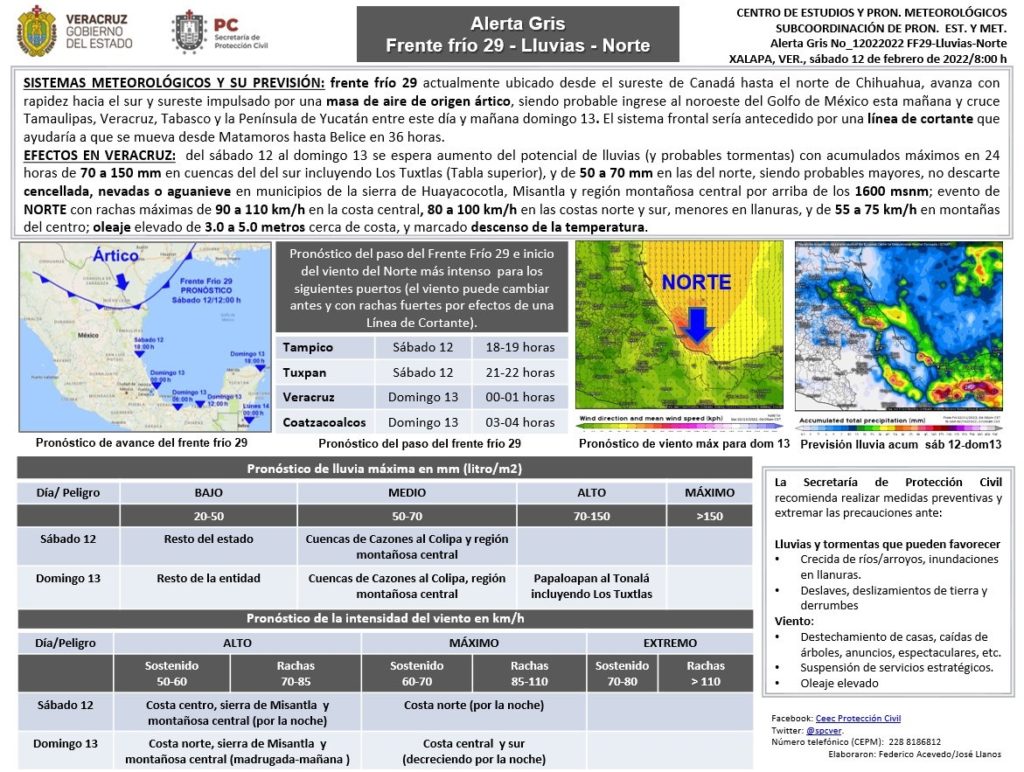 Xalapa, Ver.- La Secretaría de Protección Civil del Estado de Veracruz informa a la ciudadanía que debido a la presencia del Frente Frío #29 se activó la Alerta Gris, advirtiendo de los efectos meteorológicos que registrarán.