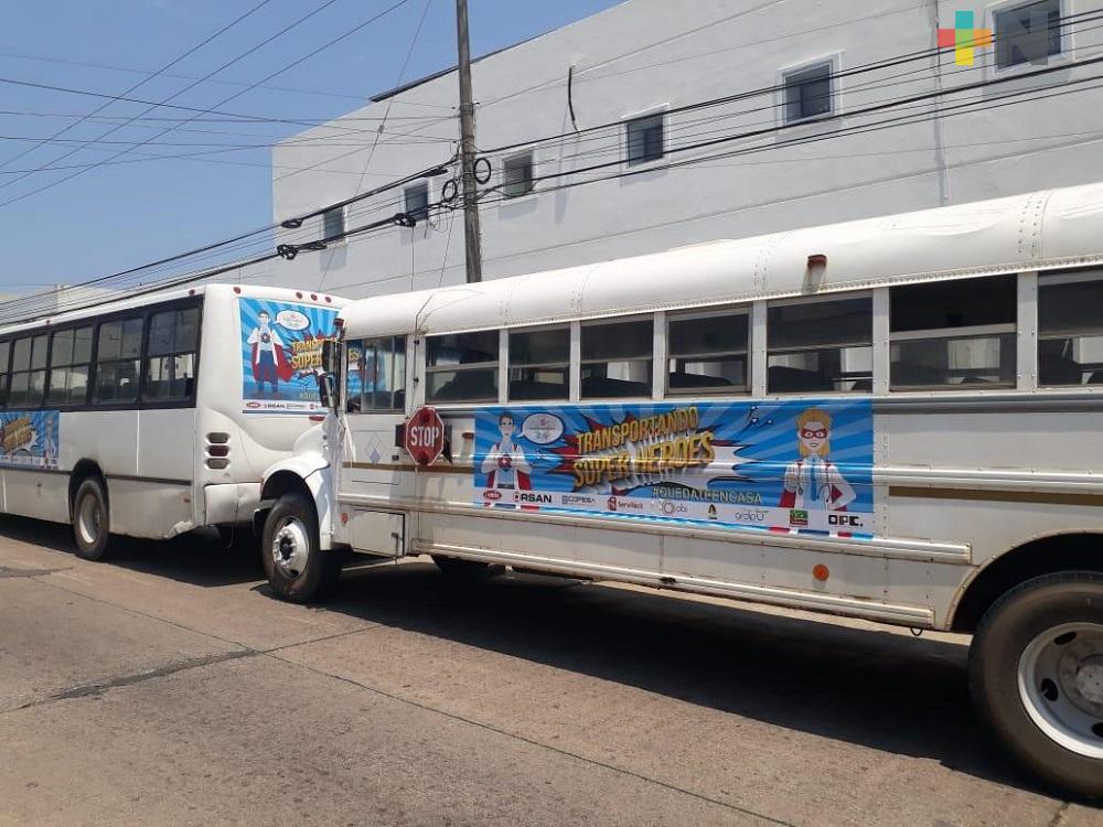 Incluso las unidades llevan la consigna “Transportando a superhéroes”, en la que se invita a la población a quedarse en casa para evitar el contagio de COVID-19.