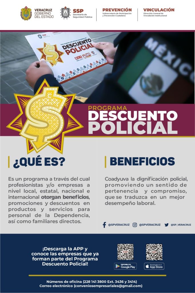 Xalapa Ver.- La Secretaría de Seguridad Pública (SSP), a través de la Dirección General de Vinculación Institucional (DGVI), por medio de la oficina de Enlace con el Sector Empresarial, colabora con empresas a nivel estatal que brindan descuentos en servicios/productos a las y los trabajadores de la institución, retribuyendo su aporte con la realización de pláticas sobre prevención del delito, por parte de personal capacitado de la dependencia. En ese sentido, empresarios reconocen la labor, al promover los descuentos en la aplicación móvil “Descuento Policial”.