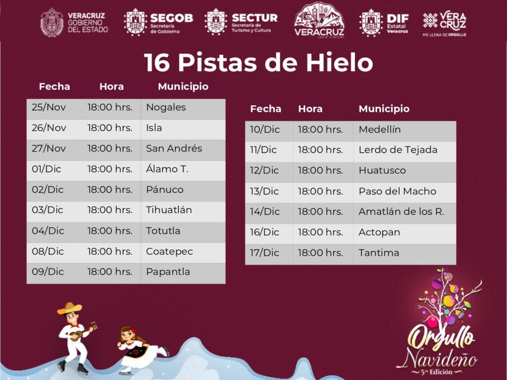 A partir del sábado 25 de noviembre se abrirá la primera pista de hielo en Nogales, y de manera escalonada las de Isla, San Andrés Tuxtla, Álamo, Pánuco, Tihuatlán, Totutla, Coatepec, Papantla, Medellín, Lerdo de Tejada, Huatusco, Paso del Macho, Amatlán de los Reyes, Actopan y Tantima.