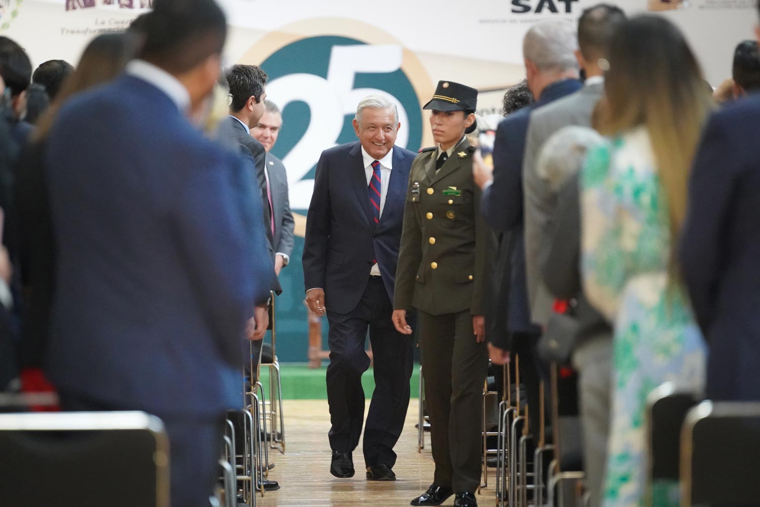 Al encabezar el 25 Aniversario del Servicio de Administración Tributaria (SAT) en Palacio Nacional, el presidente Andrés Manuel López Obrador afirmó que esta institución es un pilar de la estabilidad financiera del país y responde a las necesidades de la población.