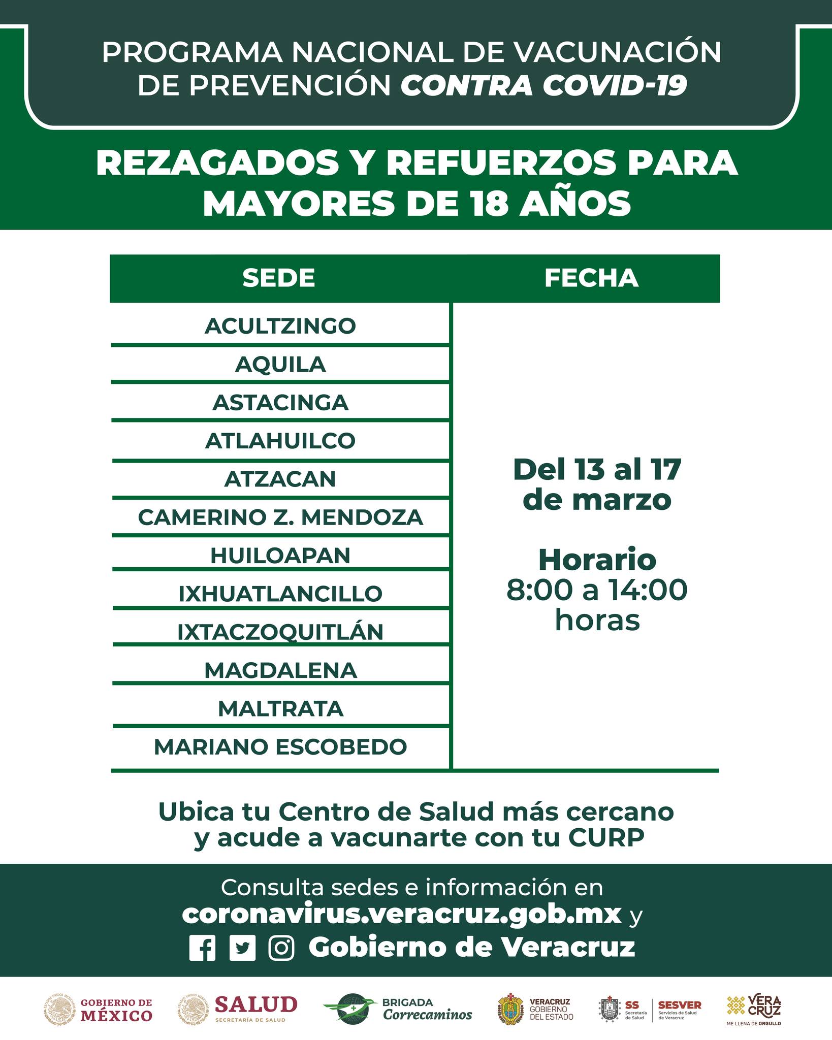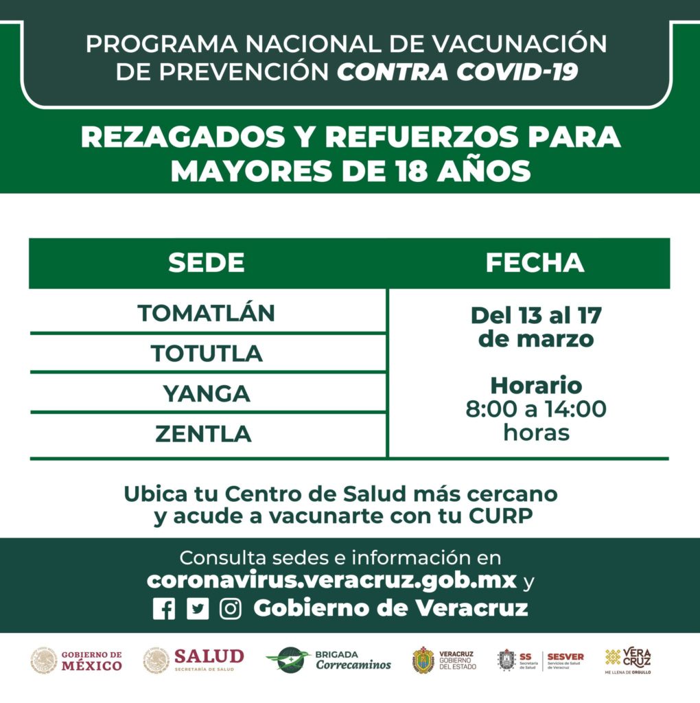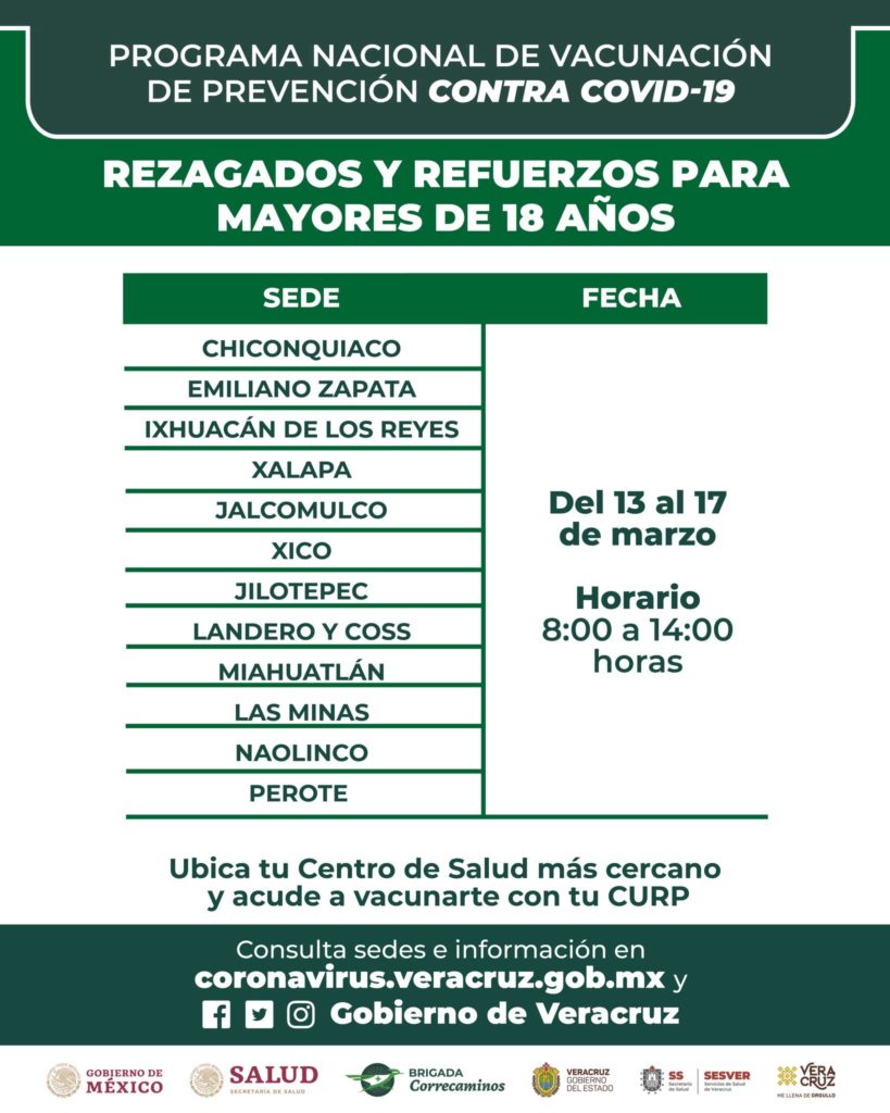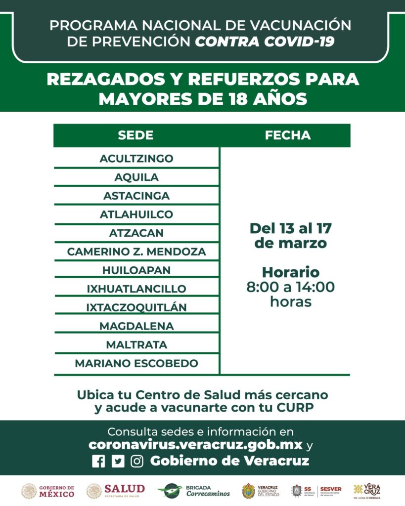 Para rezagados y refuerzos para mayores de 18 años, del 13 al 17 de marzo en horario de 8:00 a 14:00 horas se aplicarán dosis en Tlaquilpa, Tlilapan, Xoxocotla, Zongolica, Tomatlán, Totutla, Yanga, Zentla, Chiconquiaco, Emiliano Zapata, Ixhuacán de los Reyes, Xalapa, Jalcomulco, Xico, Jilotepec, Landero y Coss, Miahuatlán, Las Minas, Naolinco y Perote.