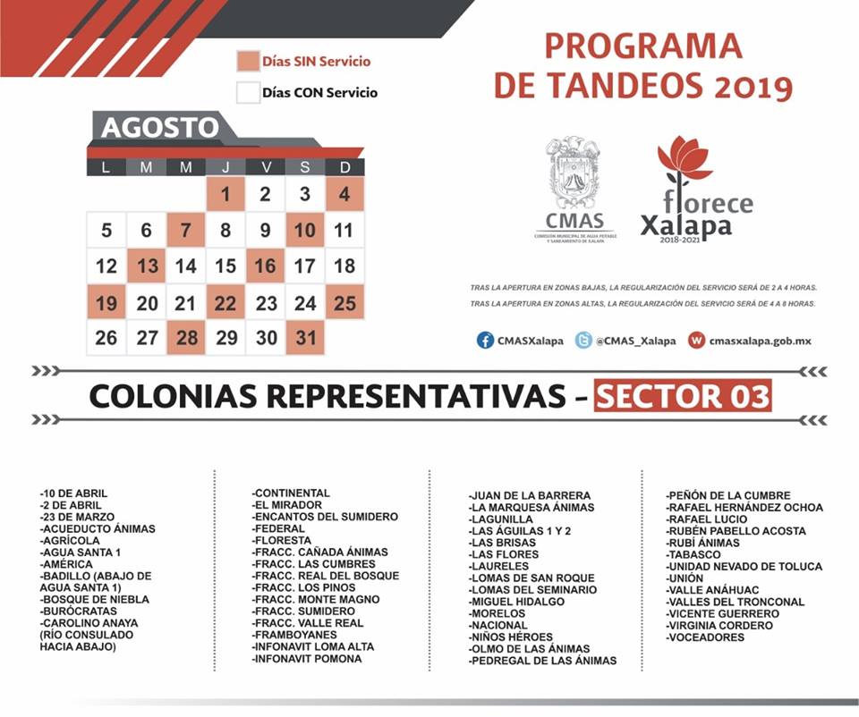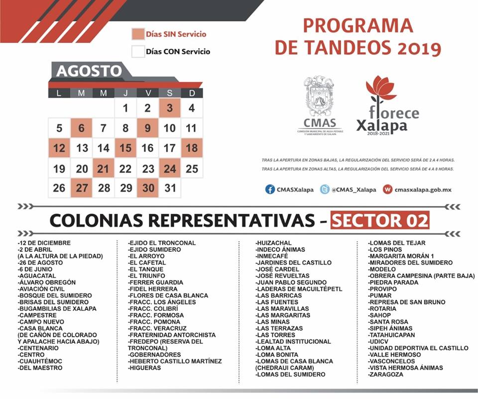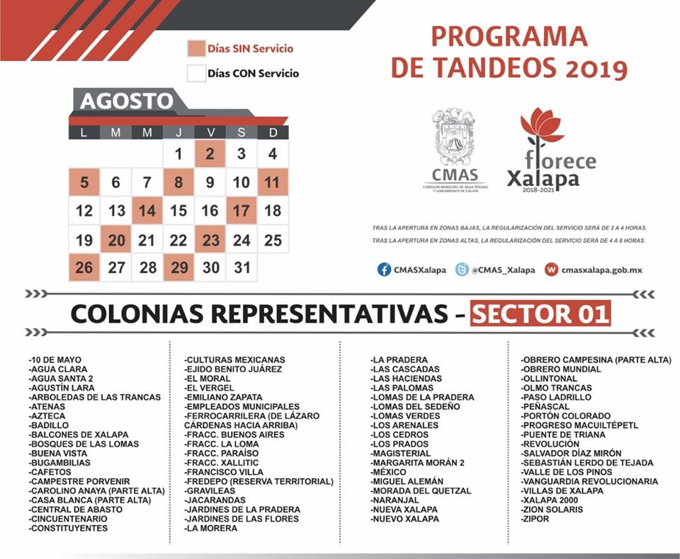 Xalapa, Ver.- Continúa en el mes de agosto el calendario de tandeo para los tres sectores en los que se divide la ciudad, cuando inicia el impacto de la temporada de estiaje en cuerpos de agua.