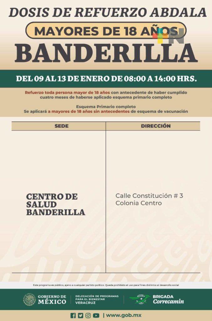 Xalapa, Ver.- Continuando con el programa nacional de vacunación de prevención contra Covid-19 de la temporada invernal, la Secretaría de Salud estará aplicando la vacuna Abdalá del 9 al 13 de enero a la población mayor de 18 años que requiera refuerzo o el esquema completo en el Centro de Salud de Banderilla, ubicada en la calle Constitución # 3.