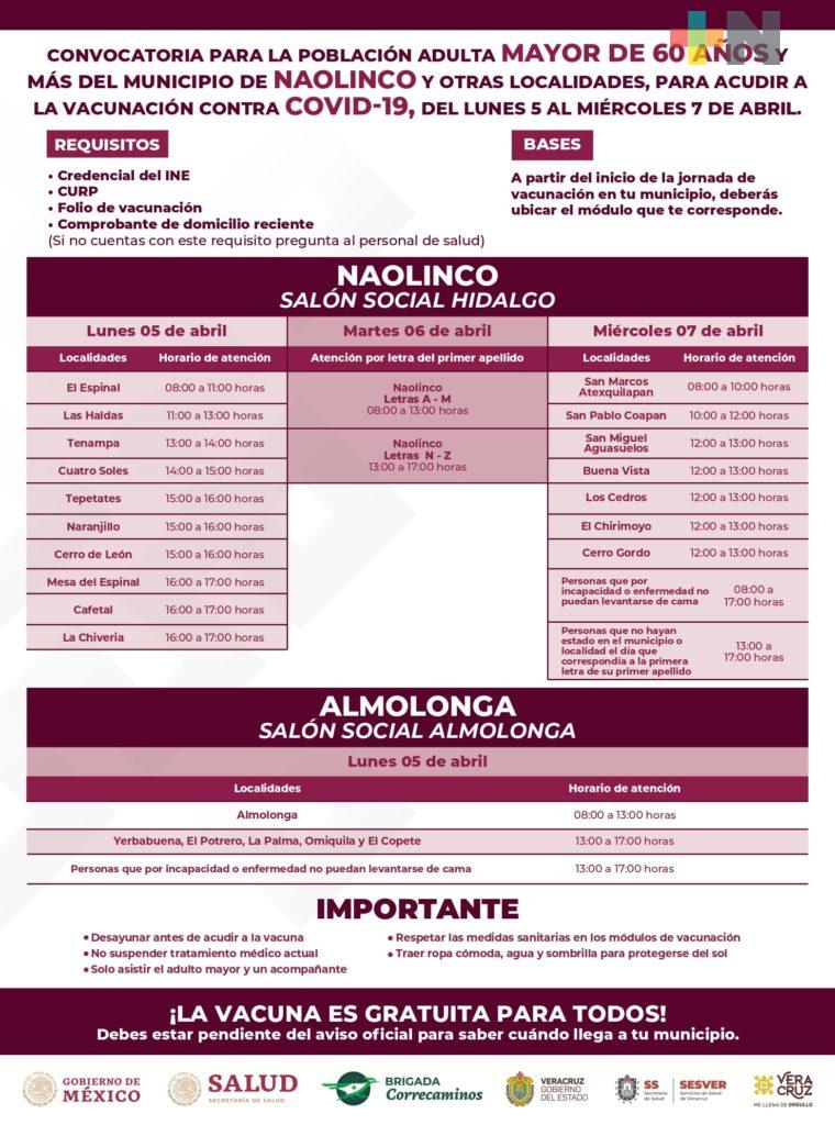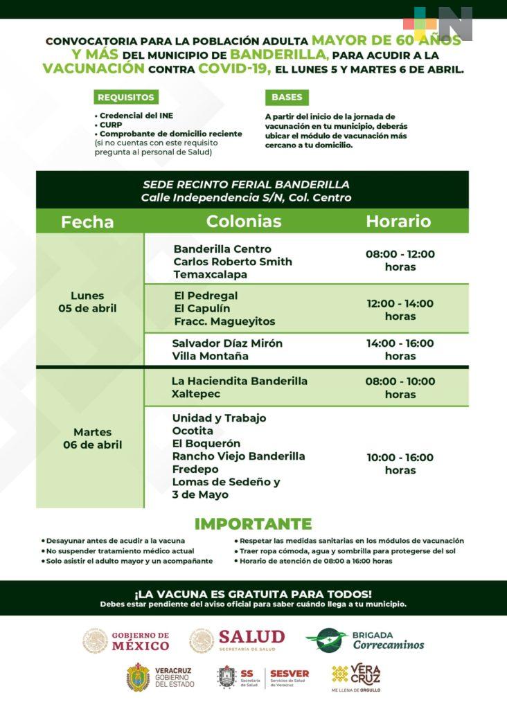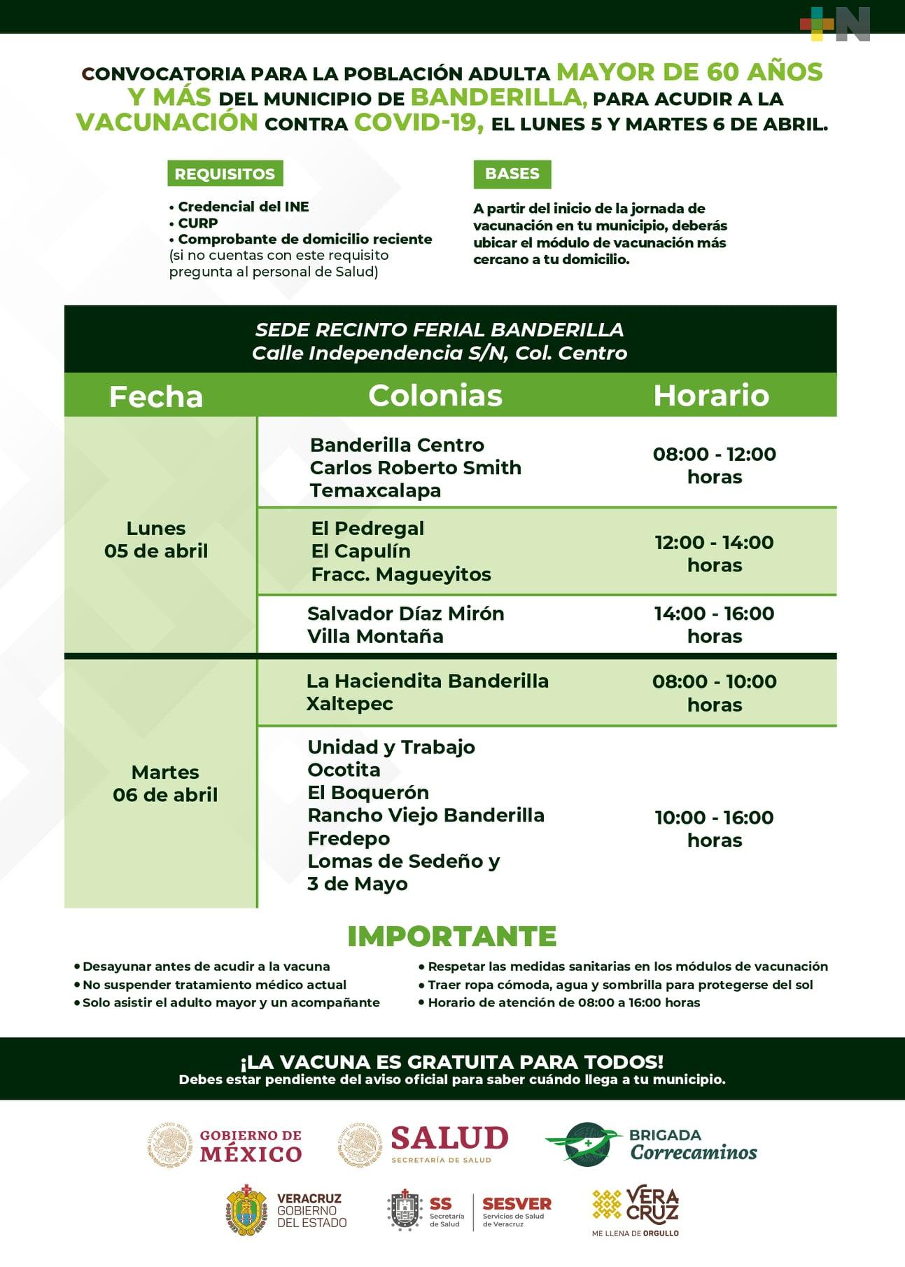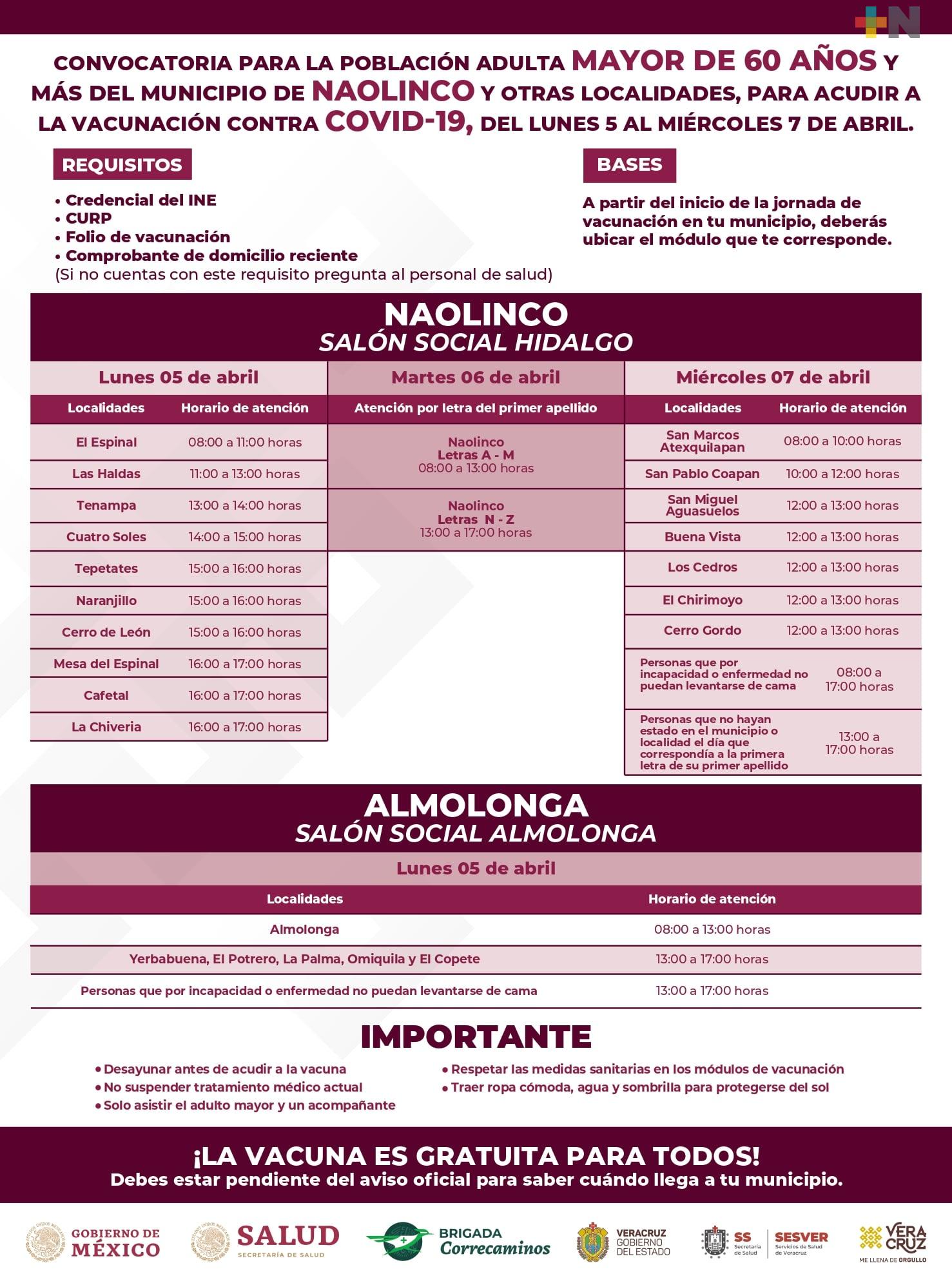 Xalapa, Ver.- A partir de este lunes 5 de abril llega la Jornada del Plan Nacional de Vacunación contra COVID-19 a Adultos Mayores de 60 años y más, al municipio de Banderilla, Emiliano Zapata, Naolinco y Almolonga.