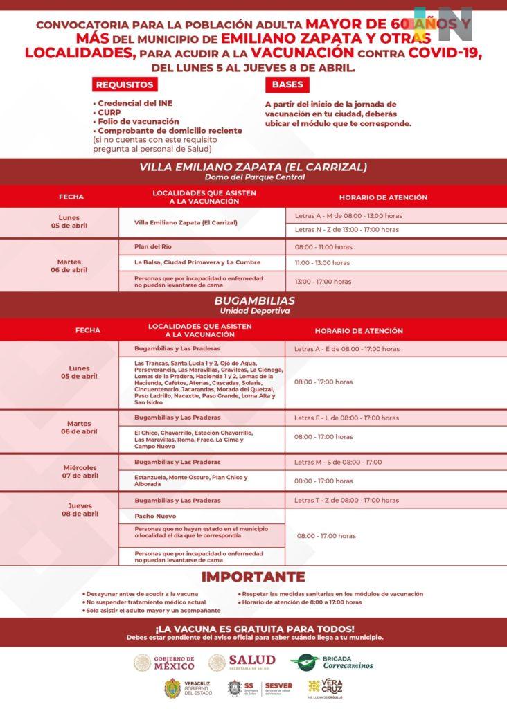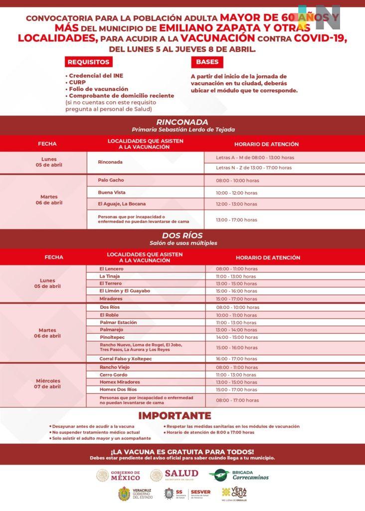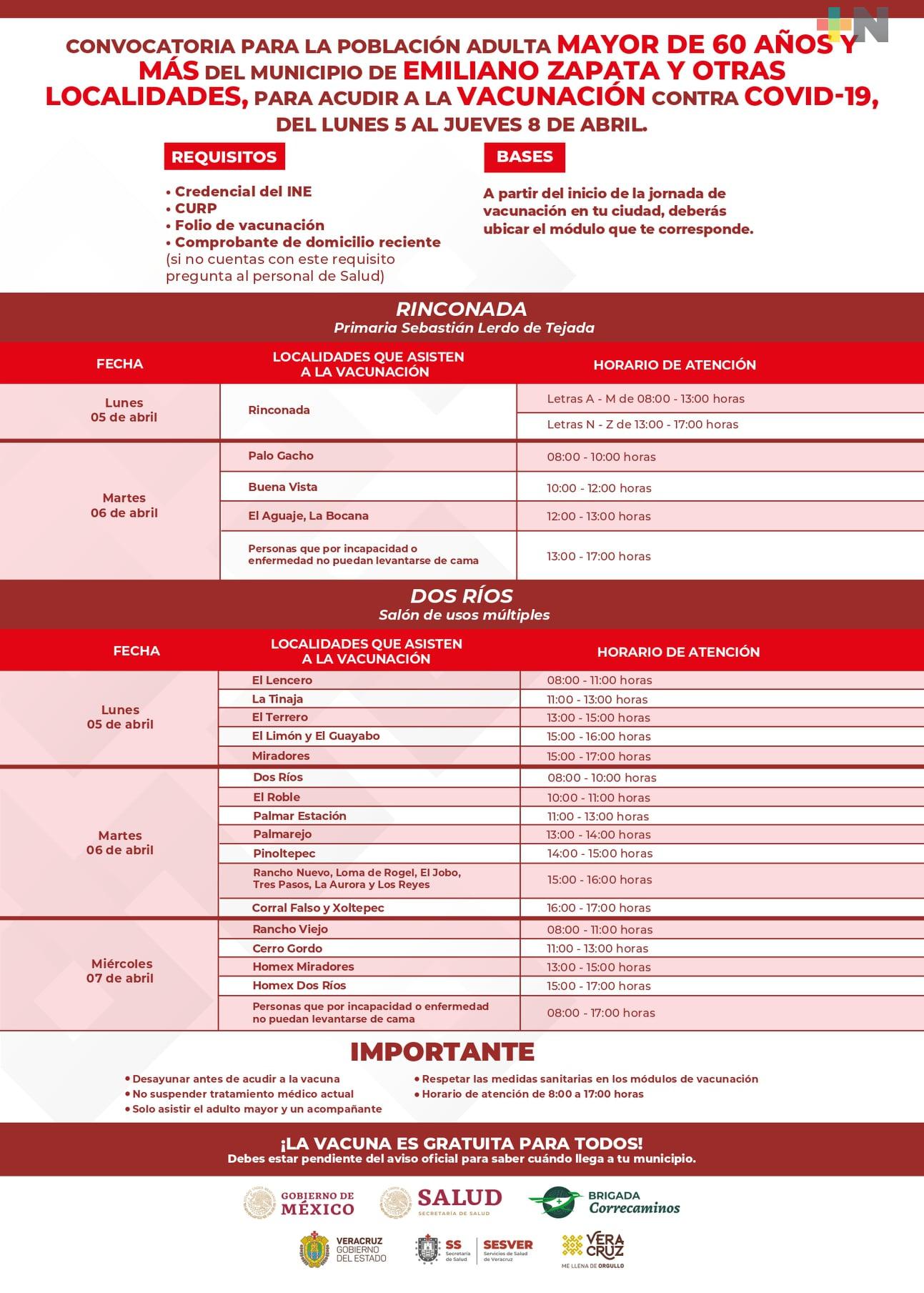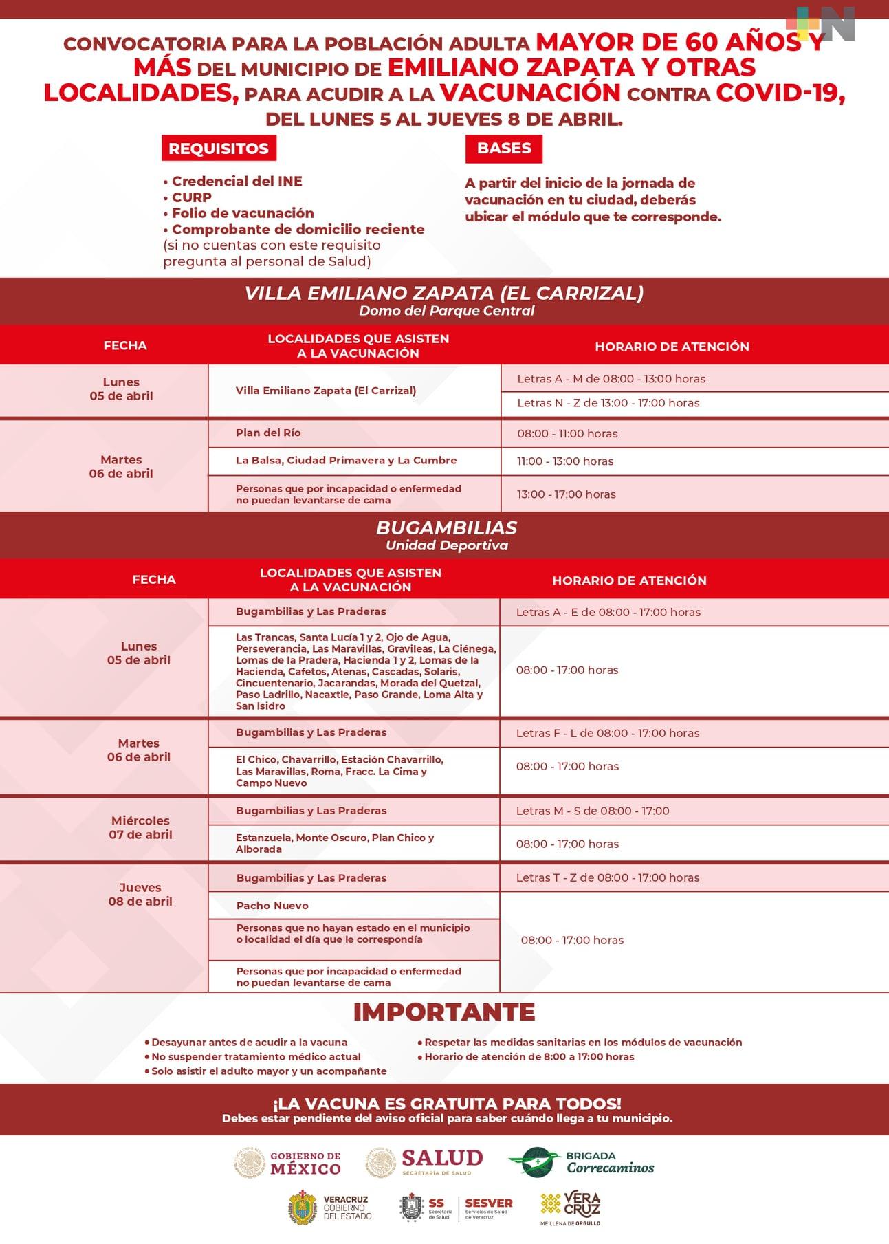 Xalapa, Ver.- A partir de este lunes 5 de abril llega la Jornada del Plan Nacional de Vacunación contra COVID-19 a Adultos Mayores de 60 años y más, al municipio de Banderilla, Emiliano Zapata, Naolinco y Almolonga.