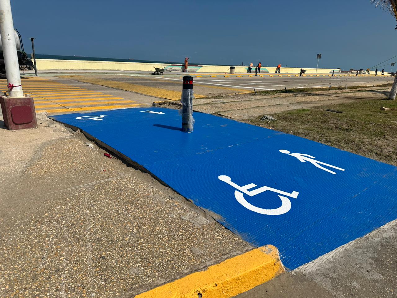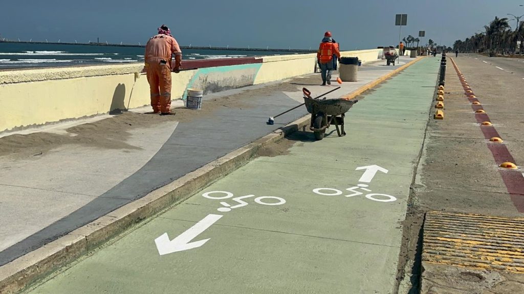 Coatzacoalcos, Ver.- Personal de la compañía encargada de la obra del malecón de Coatzacoalcos se encuentra pintando y detallando el muro, así como los señalamientos para el paso de personas con discapacidad y la ciclovía.