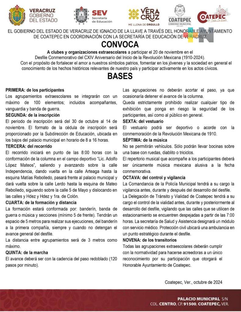 Coatepec, Ver.- Con el objetivo de fortalecer y fomentar la participación activa de la ciudadanía por nuestros símbolos patrios, el ayuntamiento de Coatepec, invita a clubes y organizaciones extraescolares, así como a las escuelas de los diversos niveles escolares a participar en el desfile conmemorativo del CXIV aniversario del inicio de la Revolución Mexicana, que se llevará a cabo el próximo 20 de noviembre, pero iniciando antes con un desfile de alumnos de preescolar, informó Luz del Carmen Olvera Laguna, subdirectora de Educación.