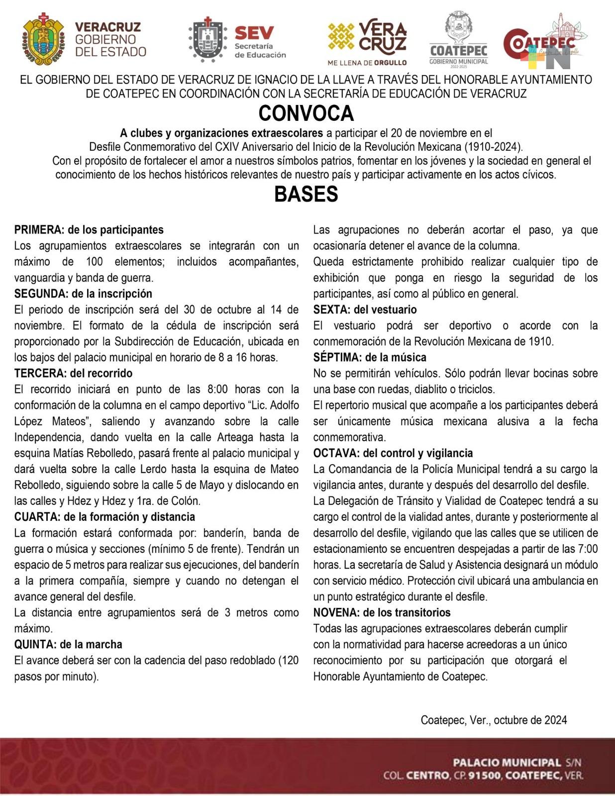 Coatepec, Ver.- Con el objetivo de fortalecer y fomentar la participación activa de la ciudadanía por nuestros símbolos patrios, el ayuntamiento de Coatepec, invita a clubes y organizaciones extraescolares, así como a las escuelas de los diversos niveles escolares a participar en el desfile conmemorativo del CXIV aniversario del inicio de la Revolución Mexicana, que se llevará a cabo el próximo 20 de noviembre, pero iniciando antes con un desfile de alumnos de preescolar, informó Luz del Carmen Olvera Laguna, subdirectora de Educación.