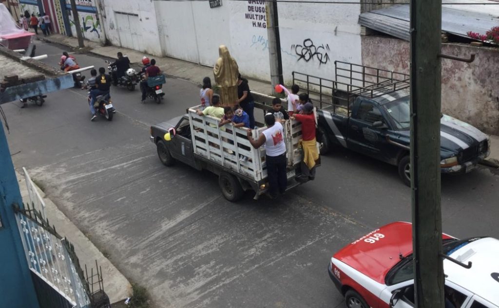 Coatepec, Ver.- Una caravana de por lo menos 30 automóviles, escoltada por motociclistas y personas a pie, acompañó a la Santa Muerte en su camino al panteón de Coatepec. Los creyentes hicieron estallar cohetes en su peregrinar por las principales calles de la ciudad.
