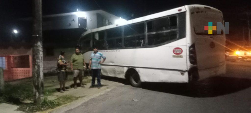 Coatzacoalcos, Ver.- Un aparatoso accidente entre un urbano y un vehículo particular dejó dos personas lesionadas y daños materiales por casi 100 mil pesos en la colonia Prócoro Alor de Coatzacoalcos, el percance fue provocado por el conductor del automóvil que manejaba en estado de ebriedad.