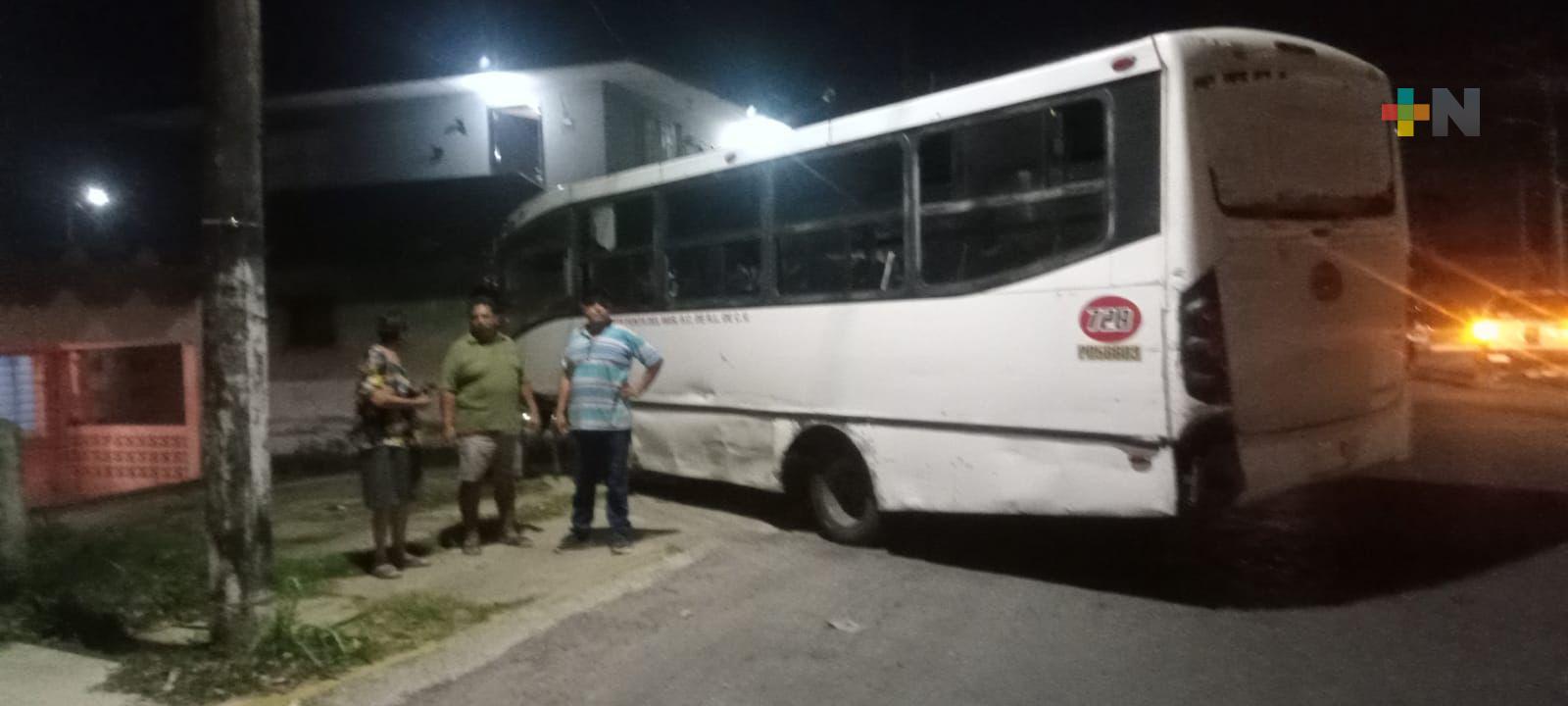 Coatzacoalcos, Ver.- Un aparatoso accidente entre un urbano y un vehículo particular dejó dos personas lesionadas y daños materiales por casi 100 mil pesos en la colonia Prócoro Alor de Coatzacoalcos, el percance fue provocado por el conductor del automóvil que manejaba en estado de ebriedad.