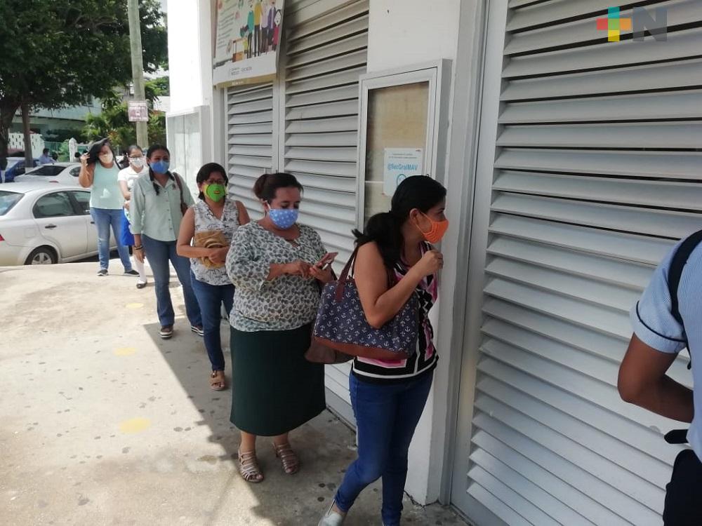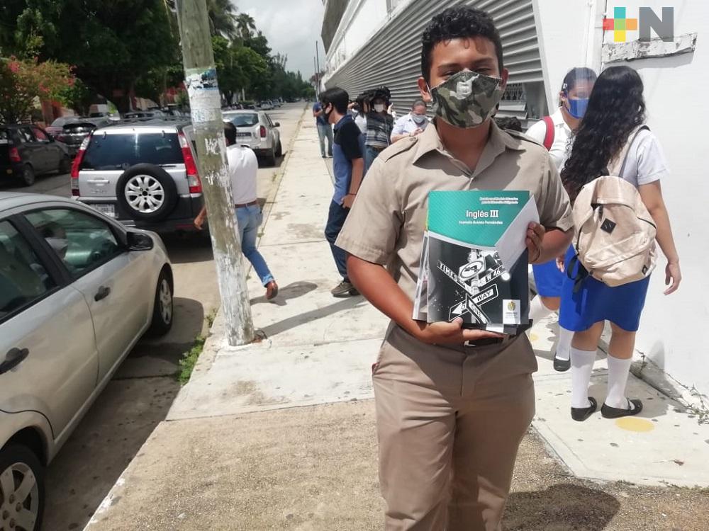 En el bachillerato Miguel Alemán González decenas de padres y alumnos hicieron fila para recibir los ejemplares que serán de gran utilidad para sus clases a distancia.