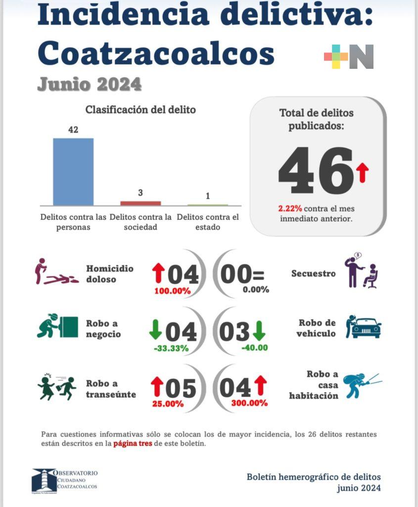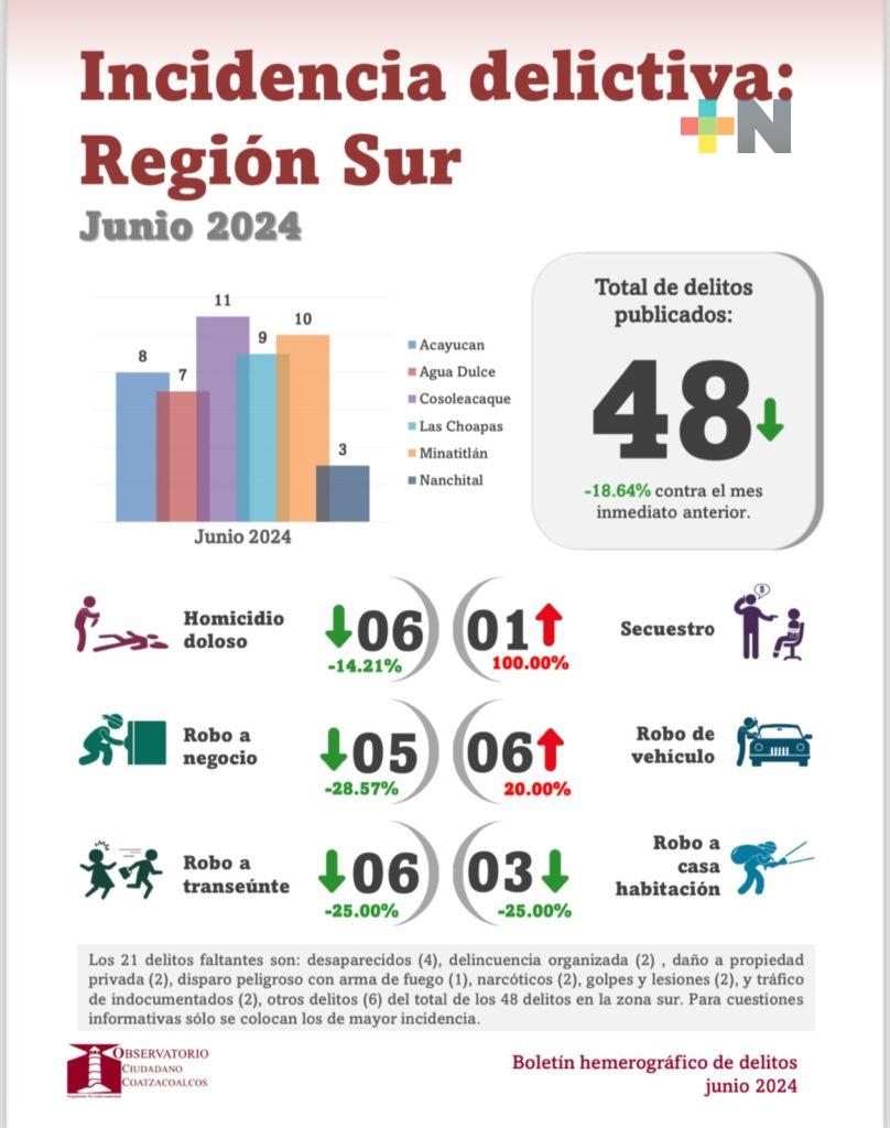En el mes de junio, Coatzacoalcos fue el municipio de la región sur que mayor incidencia delictiva presentó seguido de: Cosoleacaque con 11, Minatitlán con 10, Las Choapas con 9, Acayucan con 8, Agua Dulce con 7 y Nanchital con 3.