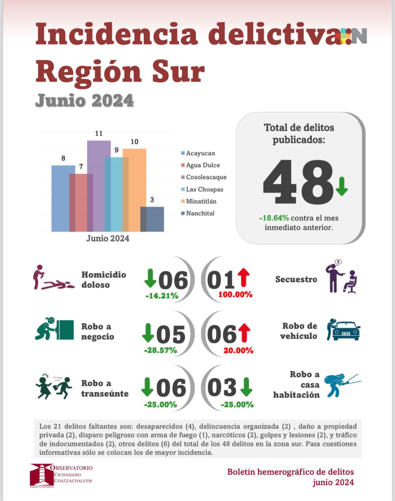 En el mes de junio, Coatzacoalcos fue el municipio de la región sur que mayor incidencia delictiva presentó seguido de: Cosoleacaque con 11, Minatitlán con 10, Las Choapas con 9, Acayucan con 8, Agua Dulce con 7 y Nanchital con 3.