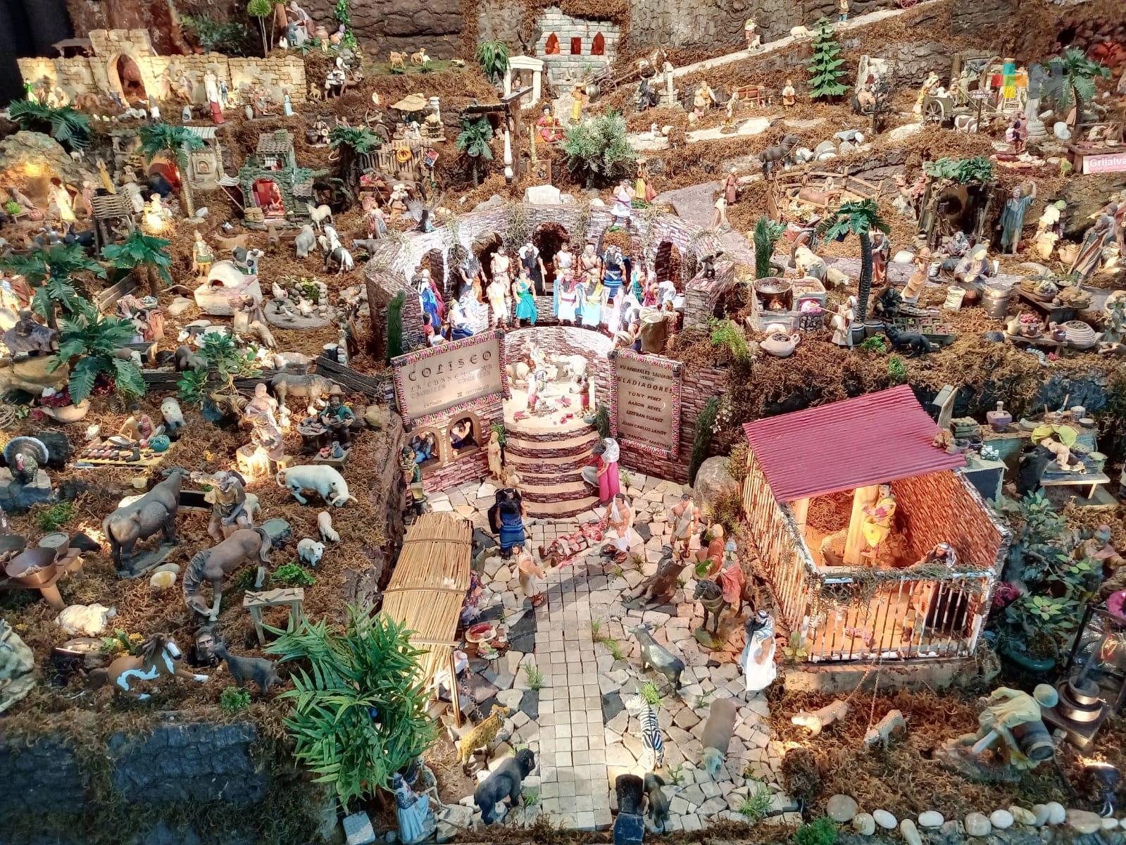 “Hay de todo, de todo un poco como comúnmente se dice, tenemos las figuras de movimiento son aproximadamente más de 120 figuras que tenemos en movimiento de diferentes tipos, por ejemplo, el niño que está por ahí rompiendo la piñata, mejor dicho es una niña que rompe la piñata; están también por ahí los cerditos alimentándose, un perrito haciendo pipí, la vaca que mueve la cola por ejemplo, este también por ahí tenemos en otro lado de los más novedosos, uno de ellos es el coliseo romano, hay diversidad de figuras de diferentes culturas digamos de alguna manera y pues algunas ya un poquito más actuales; surge en el seno familiar con una inquietud como cualquier hogar queriendo hacer algo propio de la temporada, tenemos un espacio muy pequeño donde fue surgiendo, fue naciendo y posteriormente fue creciendo porque se fueron realizando más figuras, ingresándole más cosas hasta llegar el momento en que ya no quedaba espacio donde estaba originalmente”.