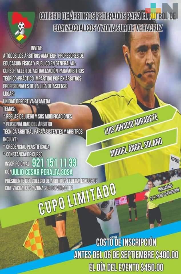 Coatzacoalcos, Ver.- El Colegio de Árbitros Federados para el Futbol de Coatzacoalcos y Zona Sur de Veracruz, convoca a los oficiales de balompié amateur, profesores de educación física y público en general al curso – taller de actualización para árbitros.