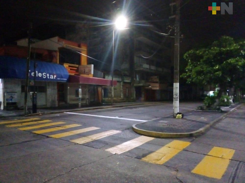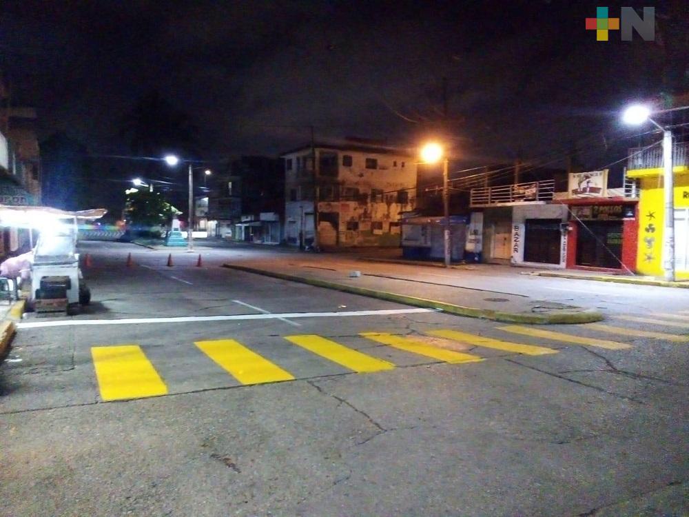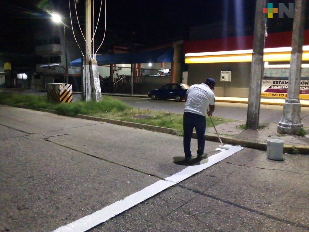 Coatzacoalcos, Ver.- La delegación de tránsito en Coatzacoalcos se encuentra realizando trabajos de balizamiento -pinta de pasos peatonales- en el primer cuadro de la ciudad durante las noches cuando hay menos afluencia de vehículos.