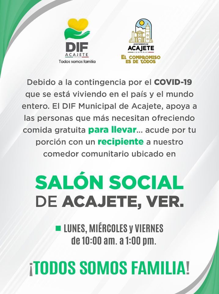 Acajete, Ver.- Como apoyo a las familias que así lo requieran ante esta contingencia sanitaria, autoridades del municipio de Acajete ofrecen comida gratuita para llevar a la población más vulnerable, como son los adultos mayores y las personas sin trabajo.