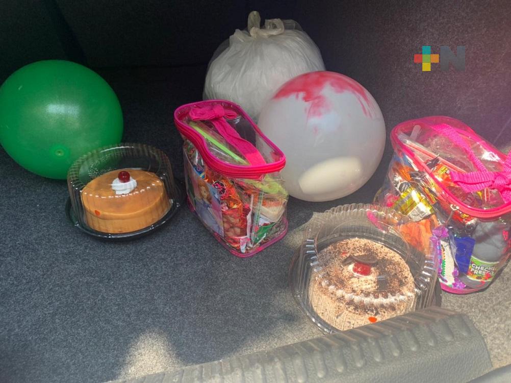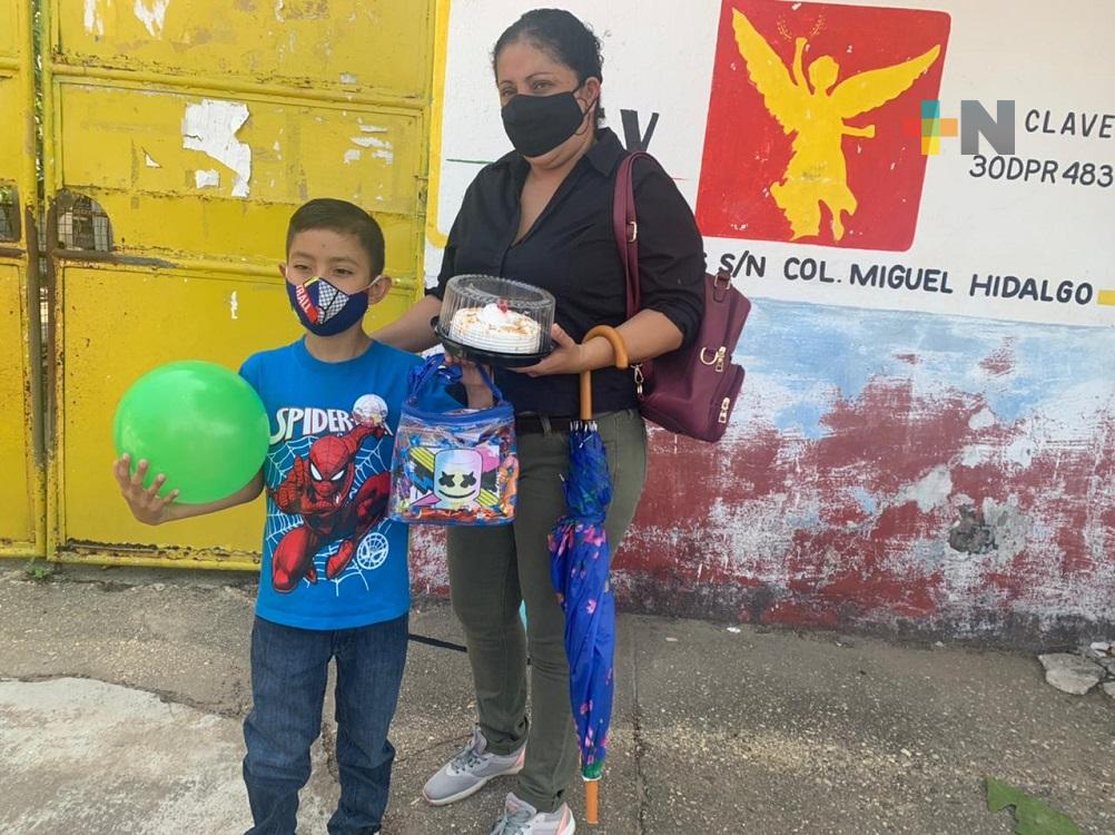 Coatzacoalcos, Ver.- Maestros y padres de familia de la Escuela Primaria Independencia festejaron el Día del Niño de manera especial, pues solo los recibieron para saludarlos y entregarles un juguete, pastel y dulces para que celebraran en casa esta fecha.