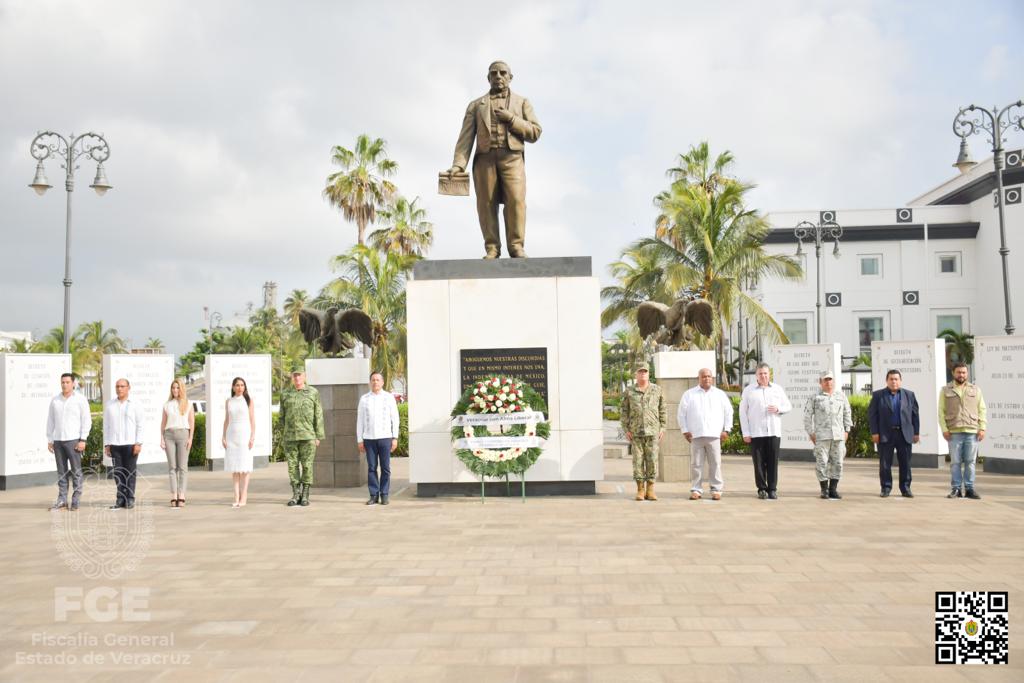 Posteriormente acompañó al Gobernador al depósito de ofrenda floral conmemorativa del 163 aniversario del Registro Civil, en el monumento erigido al Lic. Benito Juárez García, ubicado en el centro de la ciudad.