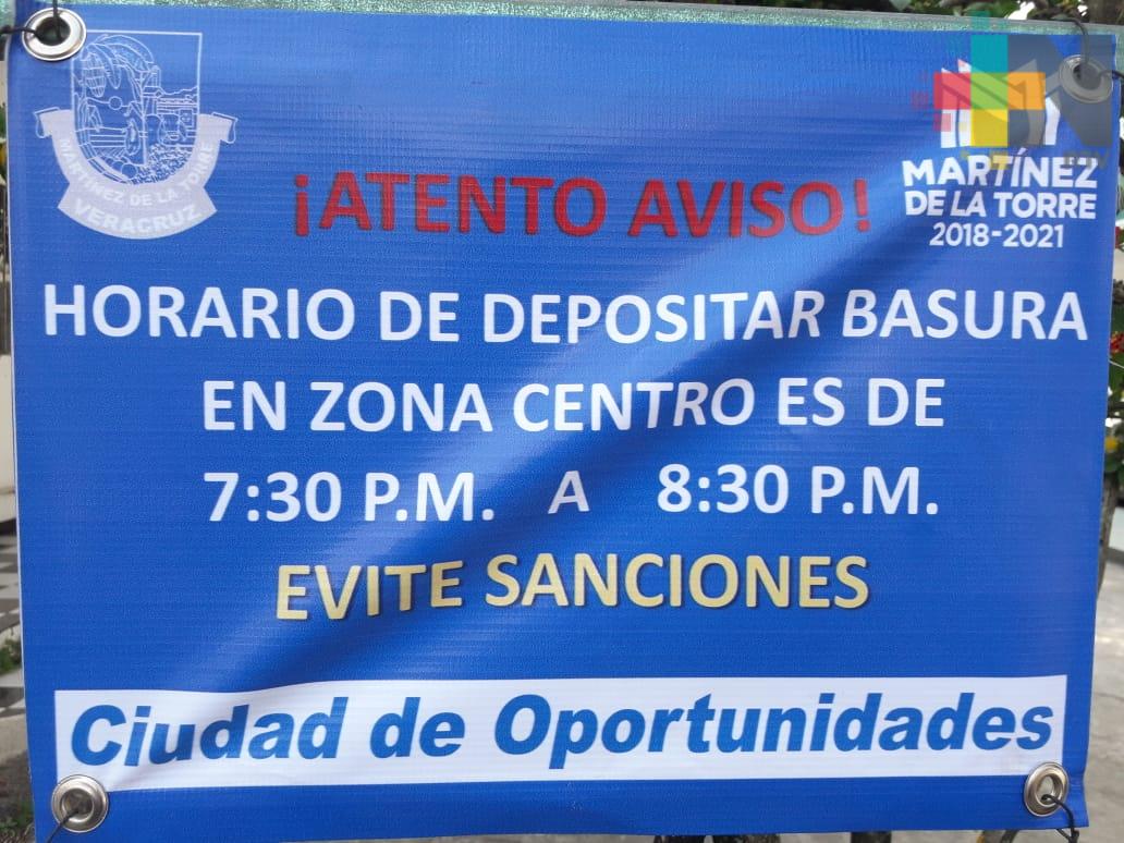 Martínez de la Torre, Ver.- La Dirección de Limpia Pública Municipal de Martínez de la Torre realiza una campaña informativa en la que exhorta a la población a mantener limpio el primer cuadro de la ciudad, sacando la basura en el horario establecido para que sea recolectada por el camión.
