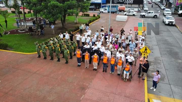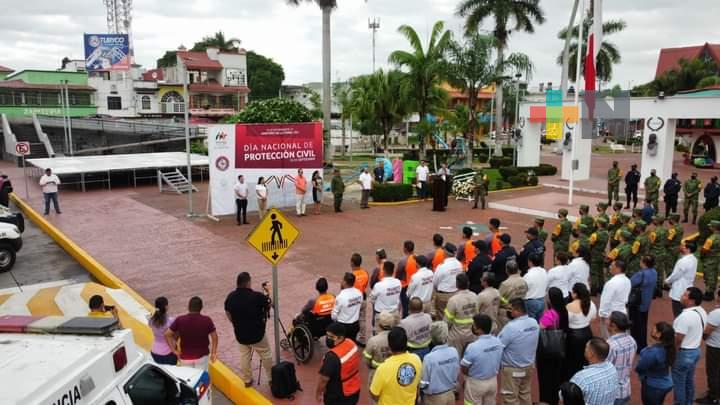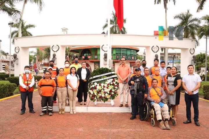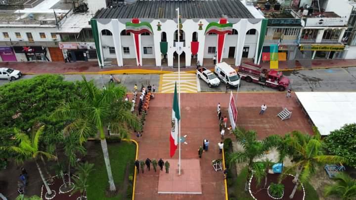 𝗠𝗮𝗿𝘁í𝗻𝗲𝘇 𝗱𝗲 𝗹𝗮 𝗧𝗼𝗿𝗿𝗲, 𝗩𝗲𝗿.- Con el toque militar de silencio, el ulular de las sirenas y las notas del glorioso Himno Nacional, este lunes, autoridades civiles y militares encabezadas por el alcalde Rodrigo Calderón Salas, realizaron un acto en el parque central José María Mata, para recodar a las víctimas de los terremotos de 1985 y 2017 y al mismo tiempo conmemorar el “Día Nacional de la Protección Civil”.