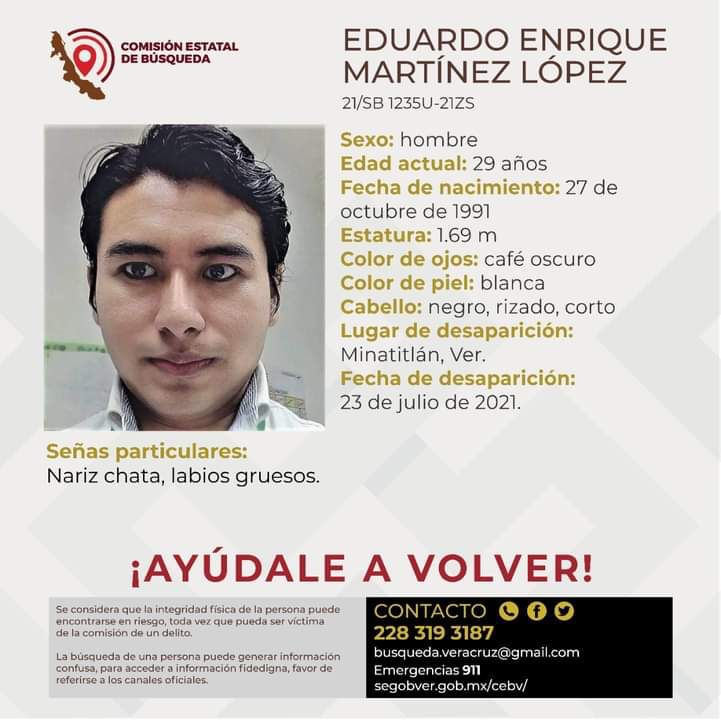 Minatitlán, Ver.- Familiares, amigos, colectivos y autoridades, realizan tareas de búsqueda en vida de Eduardo Enrique Martínez López que desapareció el pasado 23 de julio en Minatitlán.