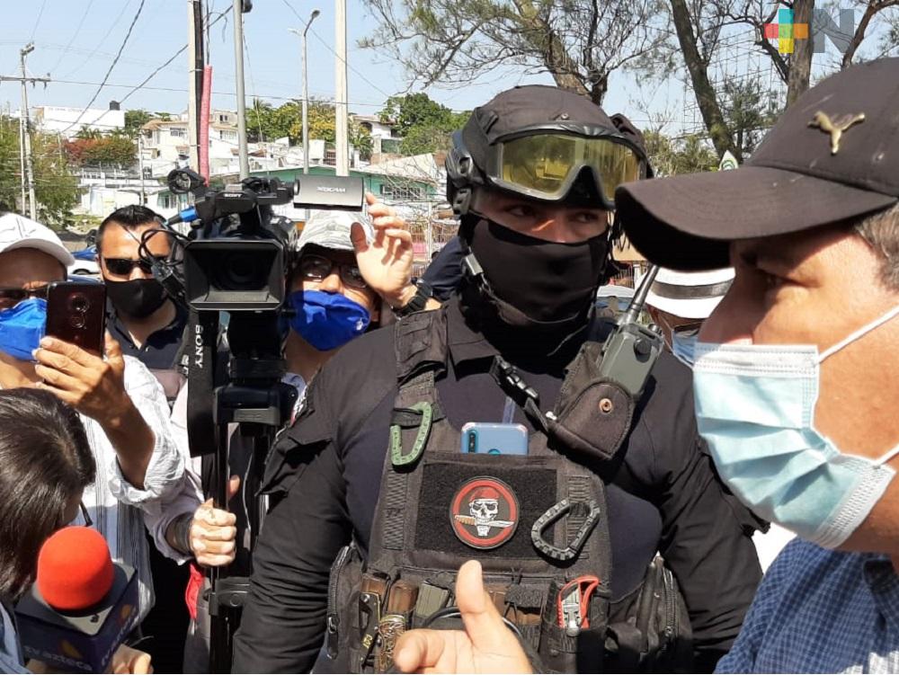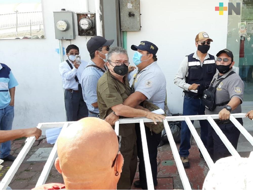 Veracruz, Ver.-Elementos de la Policía Naval y de la Secretaría de Seguridad Pública (SSP) contuvieron a un grupo de manifestantes que vandalizaron las instalaciones del Grupo MAS lanzándole tomates podridos.