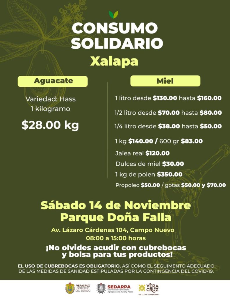 Xalapa, Ver.- La Secretaría de Desarrollo Agropecuario, Rural y Pesca (SEDARPA) invita el próximo 14 de noviembre a la Jornada de Consumo Solidario, a fin de promover la comercialización de aguacate Hass, miel y embutidos; la cita es en el Parque Doña Falla de las 08:00 a las 15:00 horas.