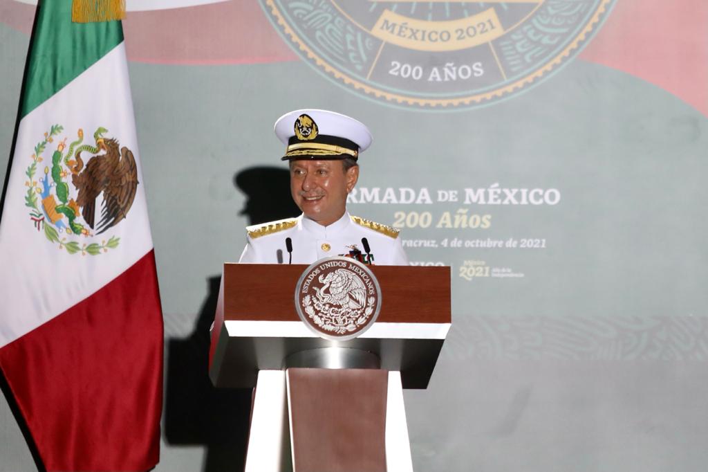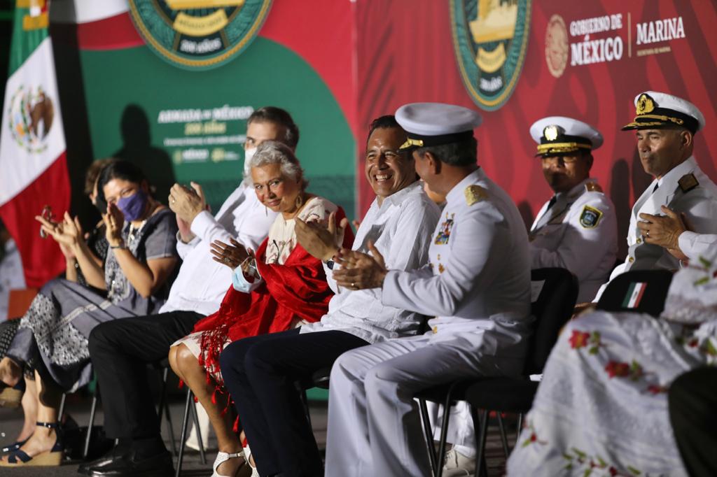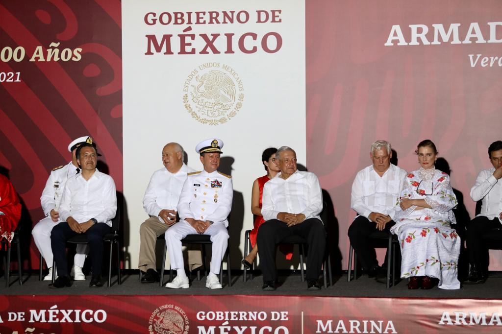 Veracruz, Ver., 04 de octubre de 2021.- Para conmemorar los 200 años de la Marina-Armada de México, que ha sido protagonista de la historia y defendido la soberanía nacional en los más de 11 mil kilómetros de costa, así como apoyado a la población ante desastres naturales, el gobernador Cuitláhuac García Jiménez acompañó al presidente Andrés Manuel López Obrador en la ceremonia protocolaria; también estuvieron los titulares de las secretarías de la Defensa Nacional (SEDENA) y de Marina (SEMAR), General Luis Cresencio Sandoval González y Almirante José Rafael Ojeda Durán, respectivamente.