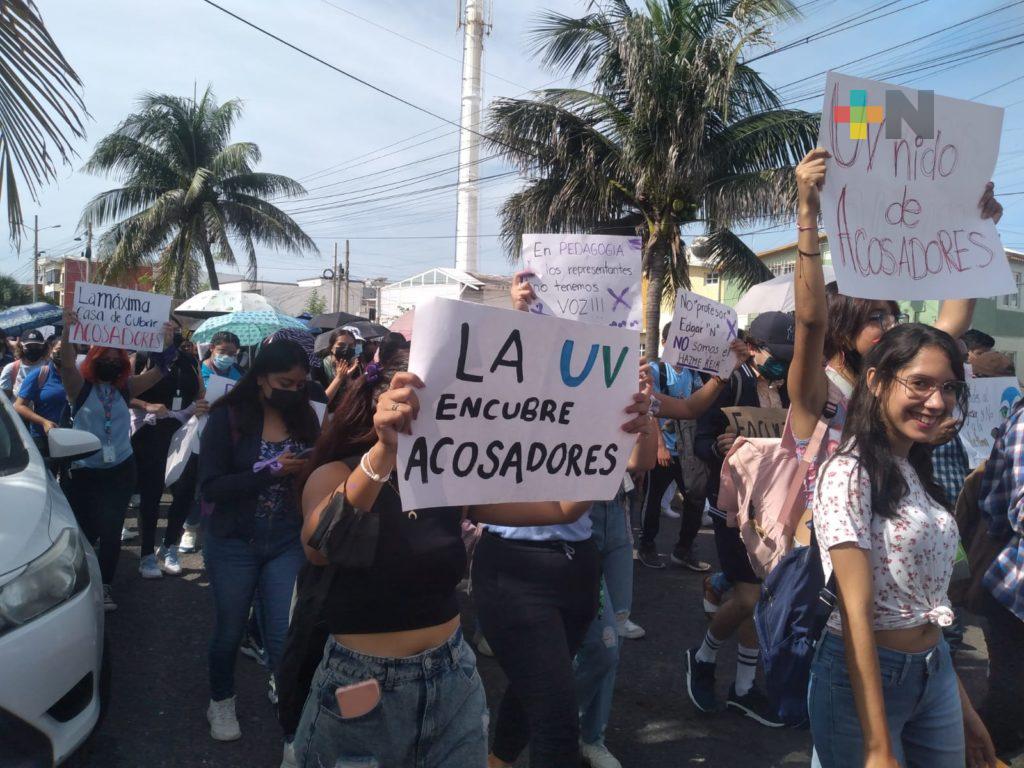 Con el apoyo de pancartas, las y los universitarios exigieron a las autoridades educativas de la UV se castigue al alumno que fue señalado como presunto acosador en un “tendedero”, además de que se garantice la seguridad y cese todo tipo de violencia.
