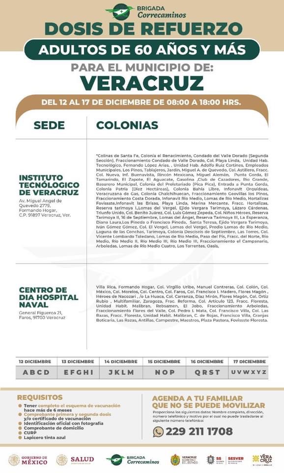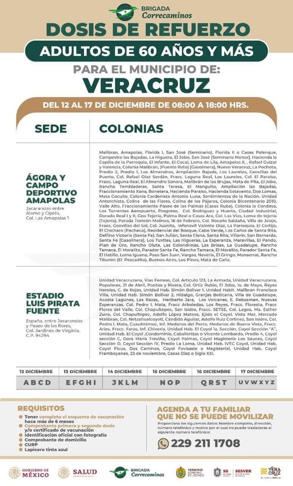 Xalapa, Ver.- El delegado federal de la Secretaría del Bienestar, Manuel Huerta Ladrón de Guevara confirmó que en los municipios de Veracruz y de Xalapa estará iniciando la vacunación de refuerzo contra Covid-19 para adultos mayores.