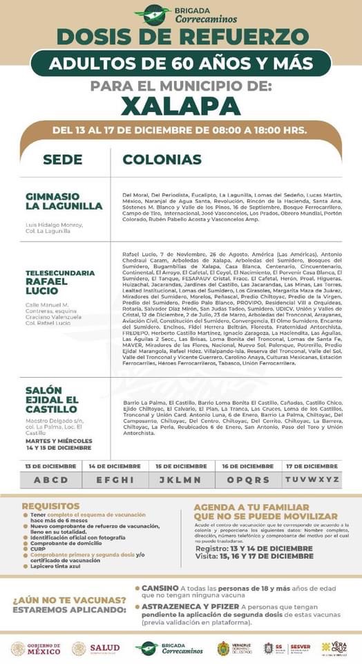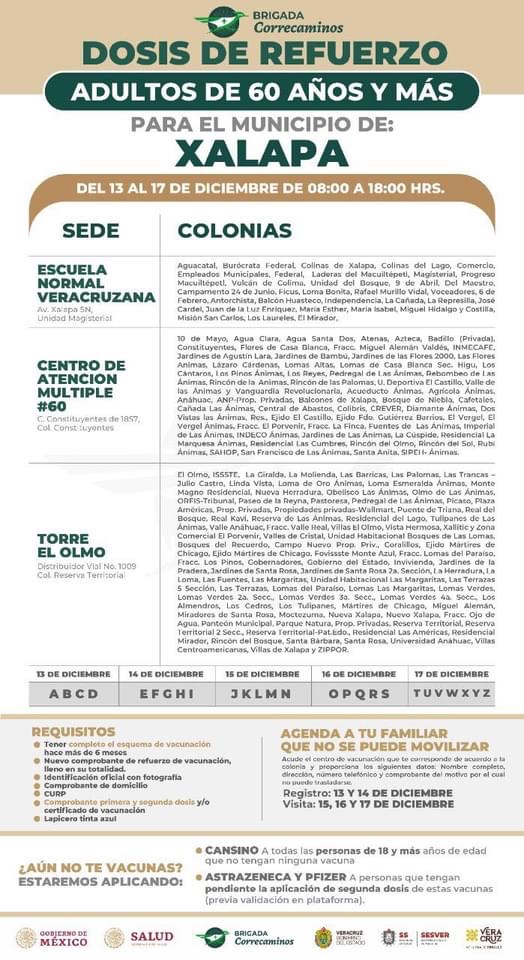 En Xalapa el periodo de vacunación a las personas de 60 y más será del 13 al 17 de diciembre; respectivamente.