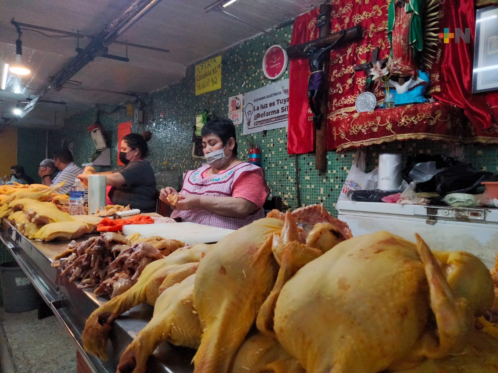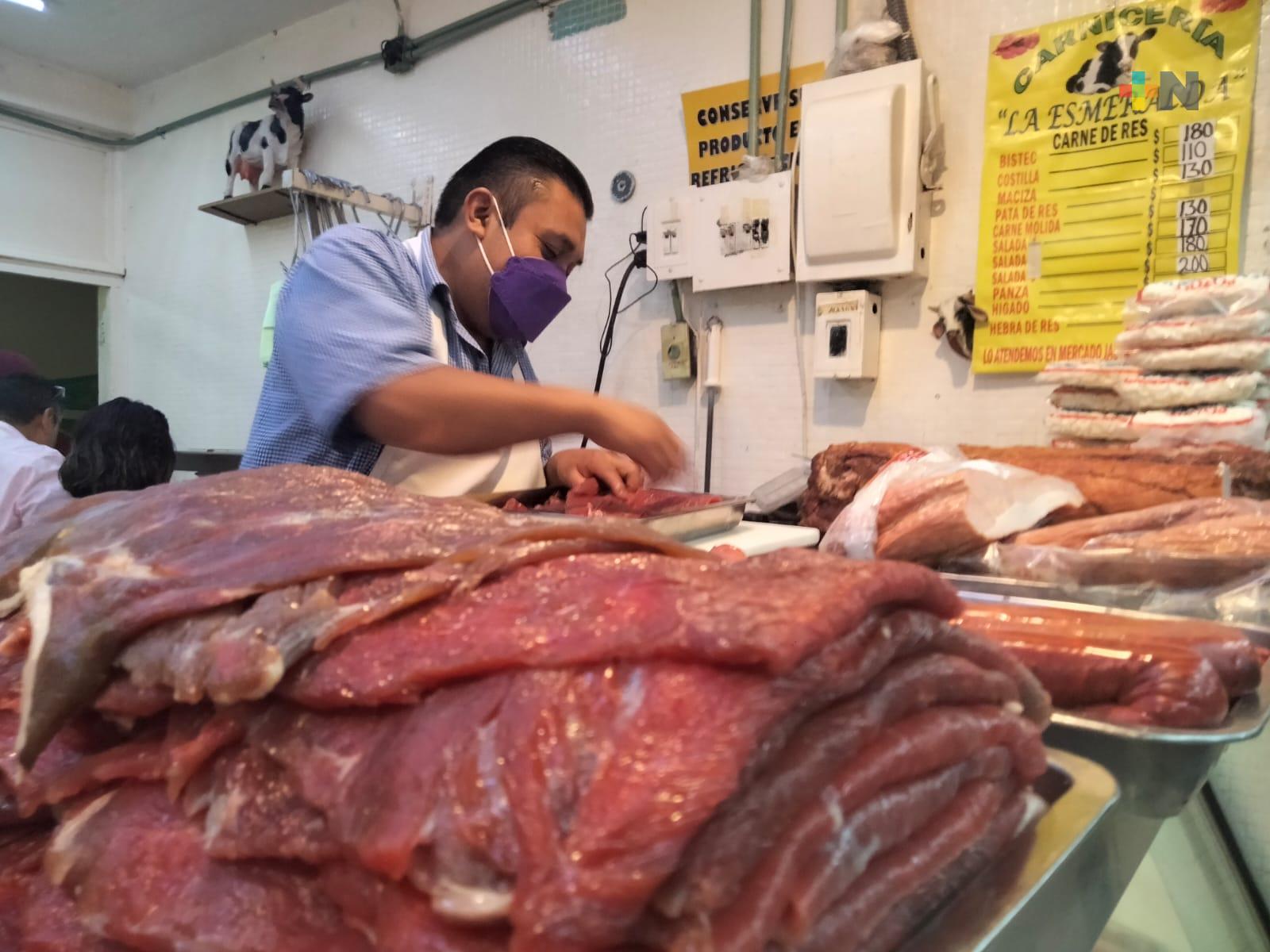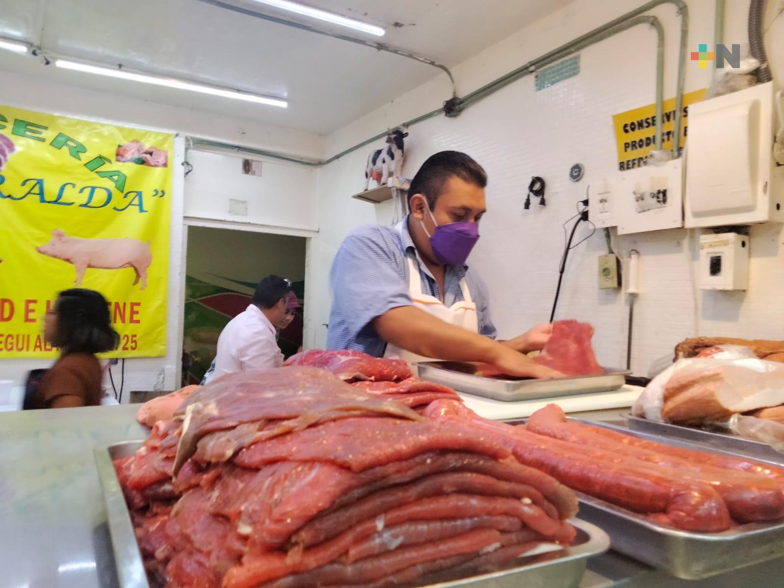 Al interior del mercado Jáuregui, los tablajeros reportan la disminución de hasta un cuarenta por ciento durante las últimas semanas; además de aumentos constantes de sus proveedores, lo que dificulta que este producto llegue a la mesa de las familias.
