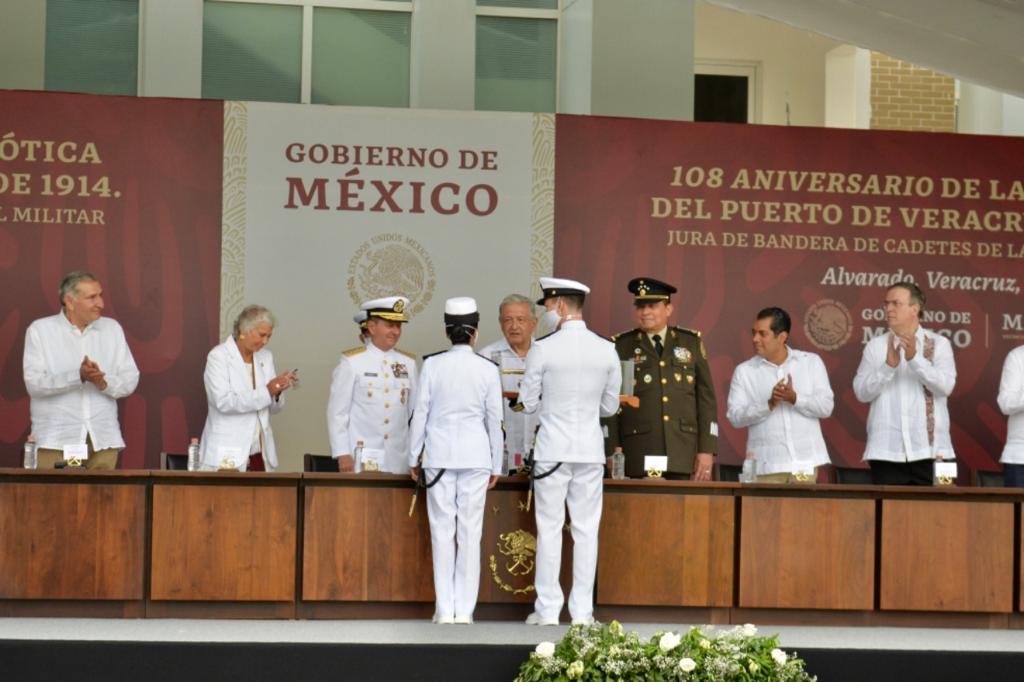 Acompañado del Ejecutivo estatal, López Obrador otorgó espadines a los egresados, símbolo que representa el don de mando requerido para su formación académica y profesional en la Armada de México, así como la responsabilidad de portarlo con gallardía. Hizo lo propio con 15 menciones honorificas, 8 condecoraciones “Bicentenario de la Armada de México” y un ascenso.