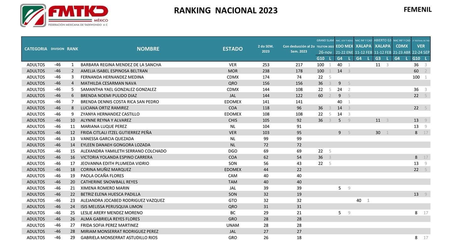 La Federación Mexicana de Taekwondo reveló el Ranking Nacional en donde Méndez de la Sancha es lider en la categoría Adultos menos 46 kilogramos femenil superando a la morelense Amelia Espinosa y a la distritense, Fernanda Hernández.