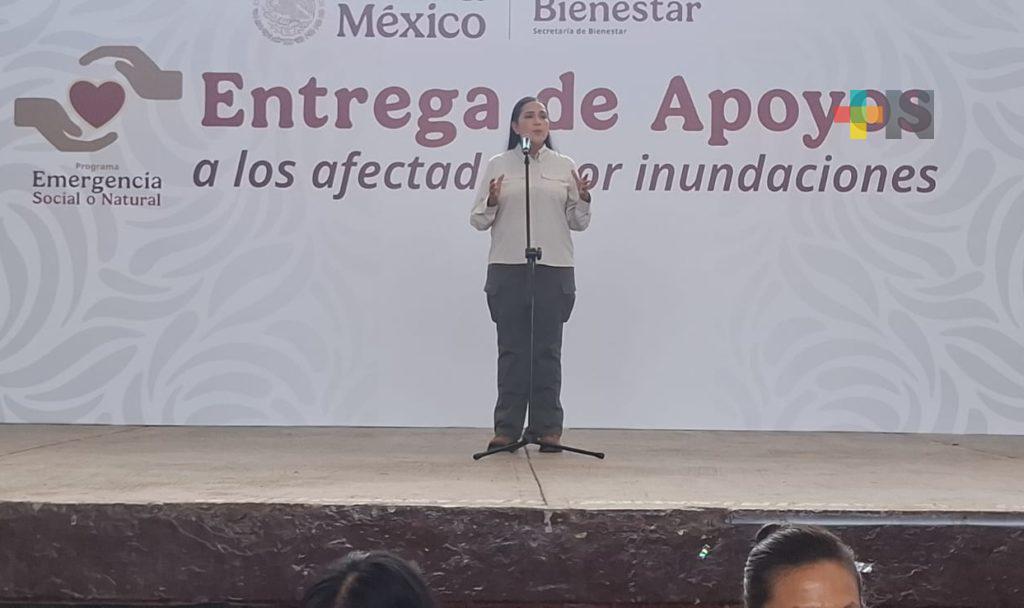 Poza Rica, Ver.- La secretaria del Bienestar del Gobierno Federal, Ariadna Montiel Reyes, entregó los primeros apoyos a los afectados por inundaciones en la zona norte del estado.